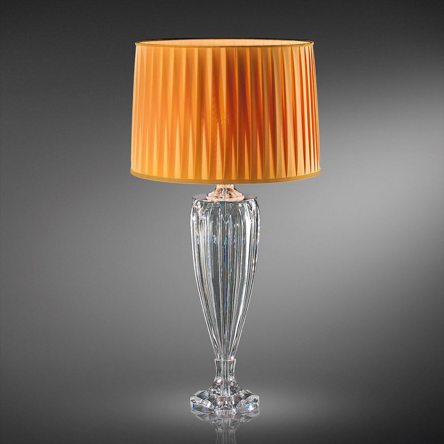 Table lamp in carved crystal with yellow pleated fabric shade. Metal details with chrome finish.