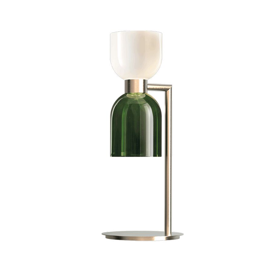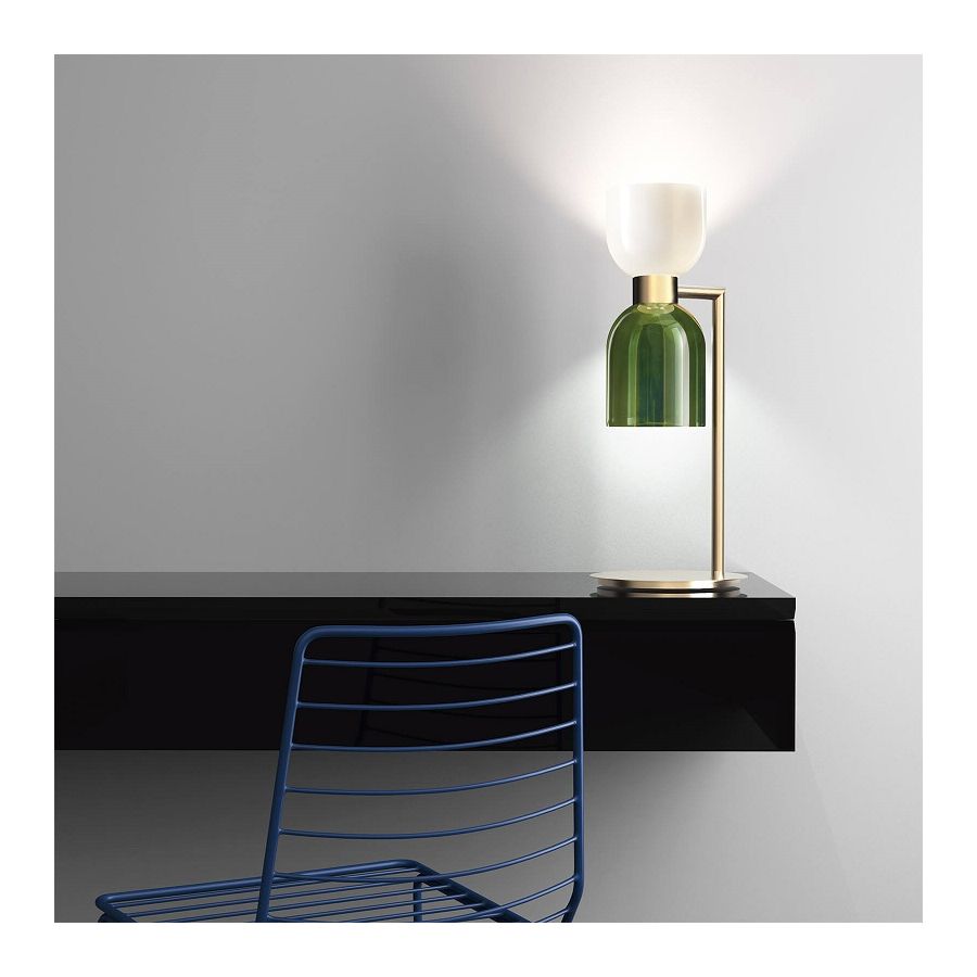 Table lamp in metal with brushed gold finish with opal white and green glass diffusers.
