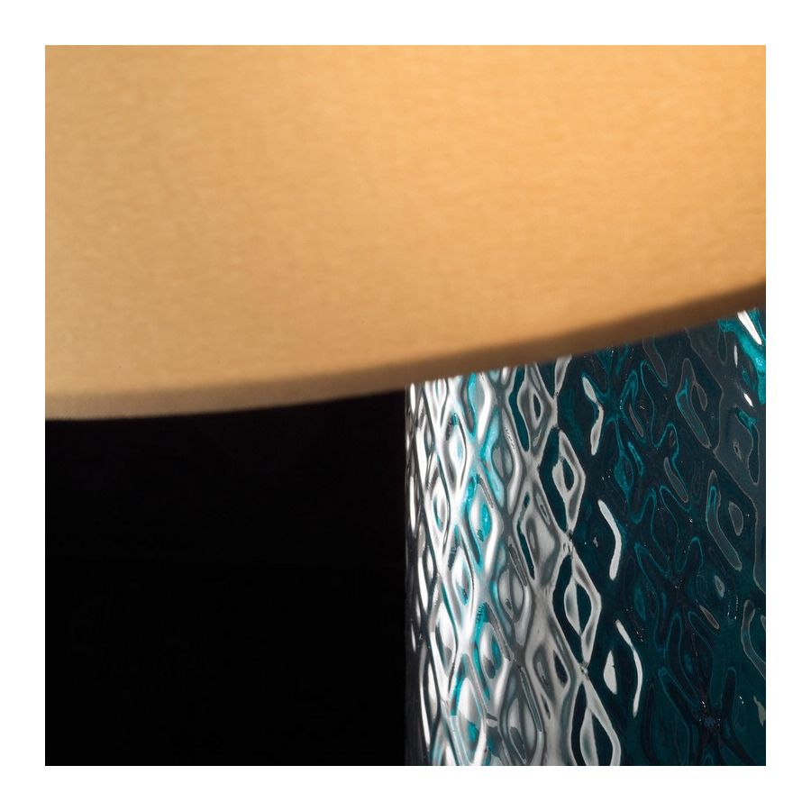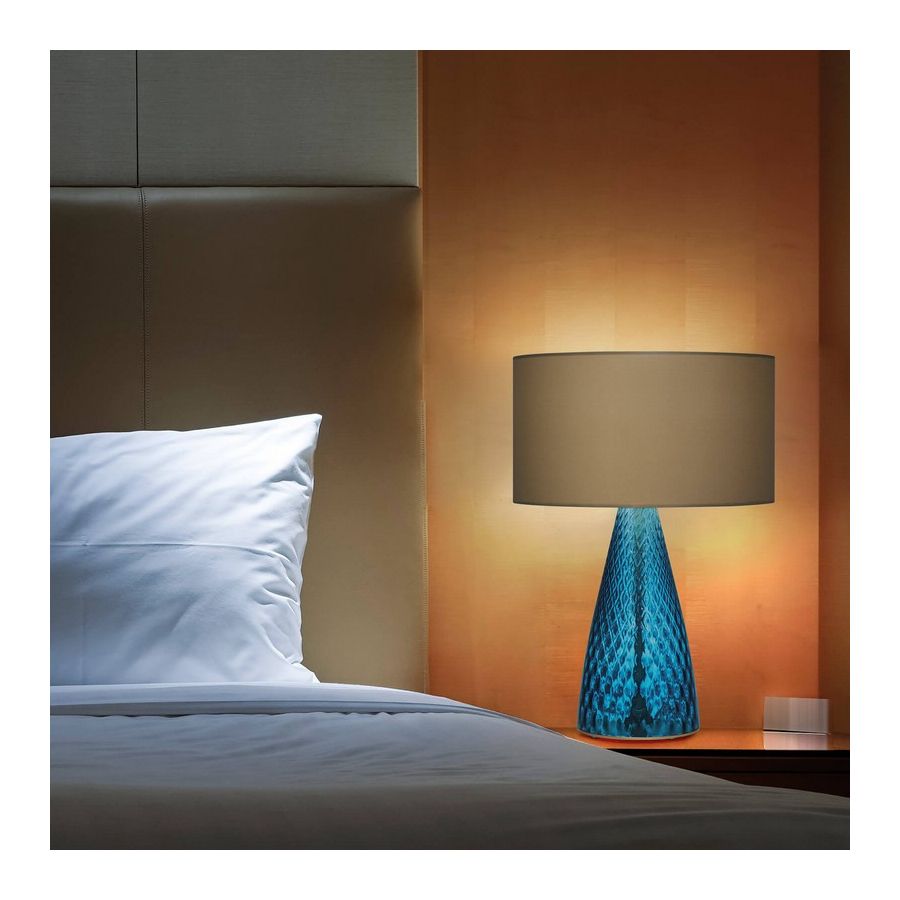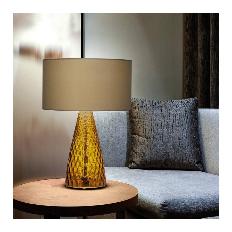 Table lamp in colored glass with hazelnut fabric shade and chrome finish details. Available in different dimensions and colours.