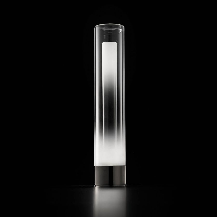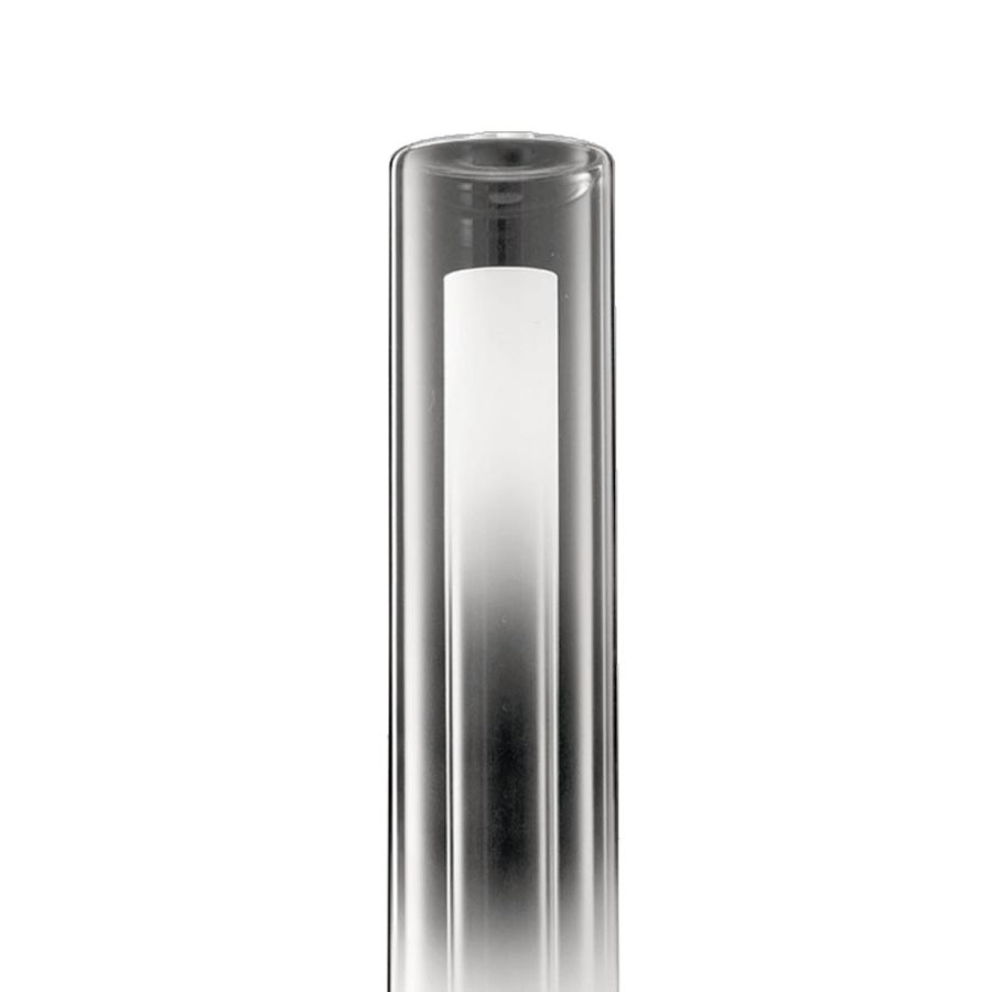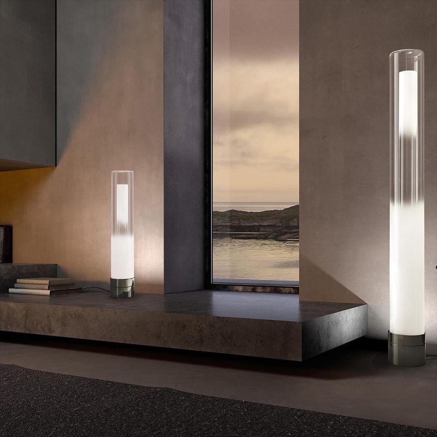 Table lamp composed of two clear glass cylinders, one included in the other, with white smoked effect for convergent fades. Metal base with iron grey finish.