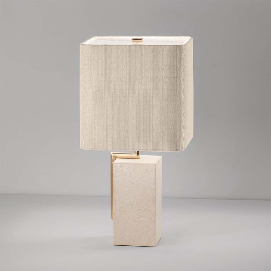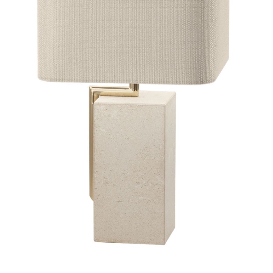 Table lamp with ivory fabric diffuser. Metal structure with light gold finish and Vicenza stone base.