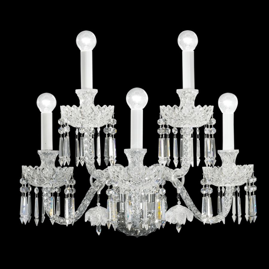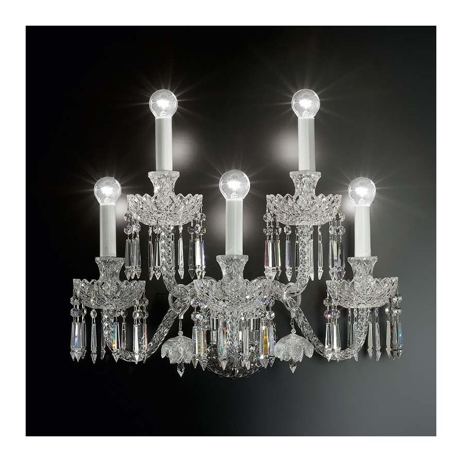 Wall lamp in carved crystal, metal with gold finish, Swarovski elements pendants and decorative glass flowers.