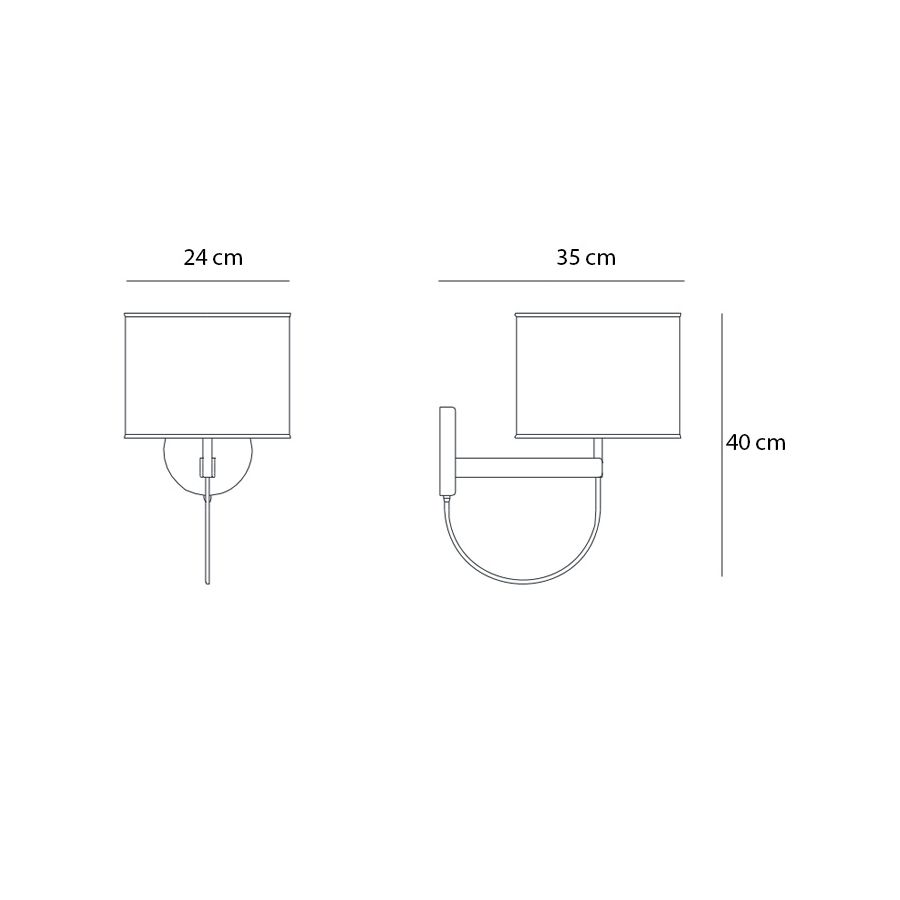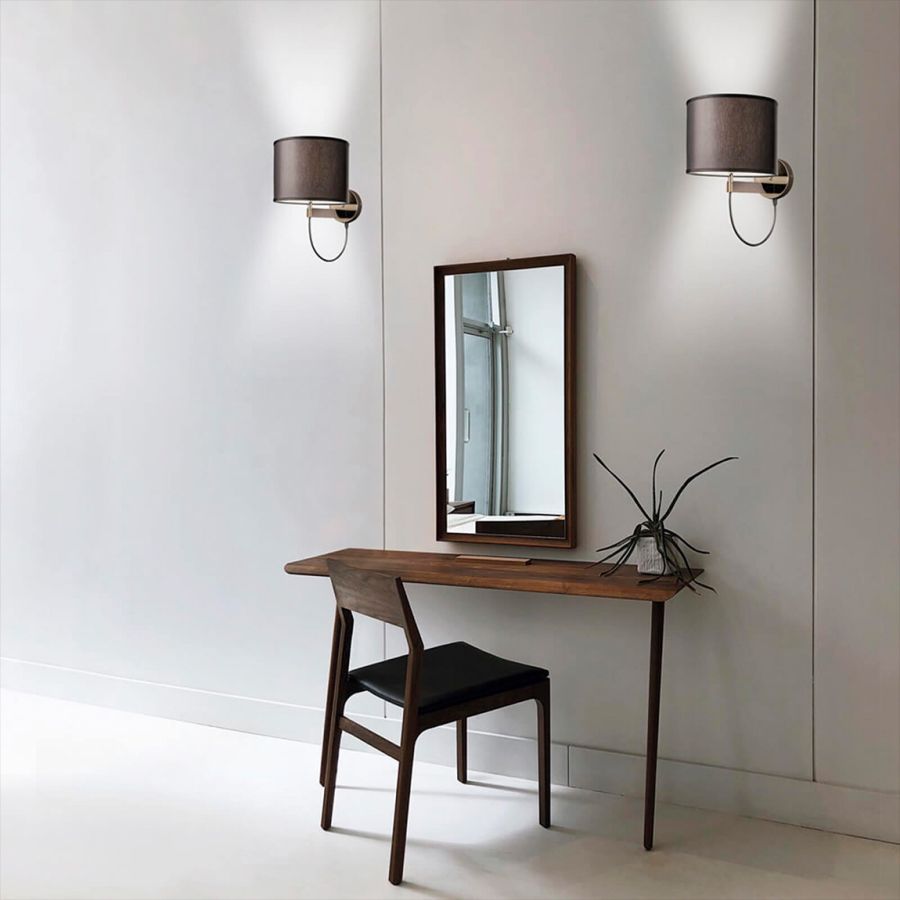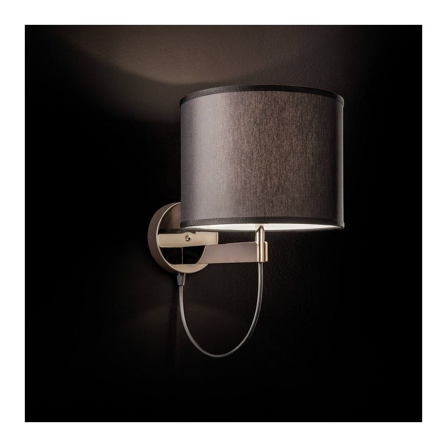 Wall lamp in metal with light gold finish and black fabric diffuser.