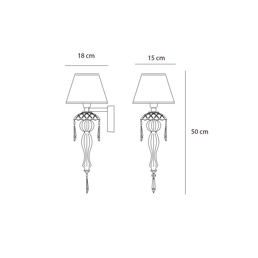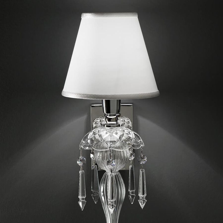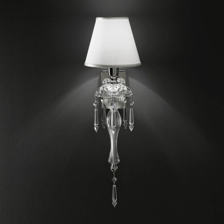 Wall lamp in carved crystal and glass, metal with nickel finish, ivory fabric shade and Swarovski elements pendants. Available in different colours.
