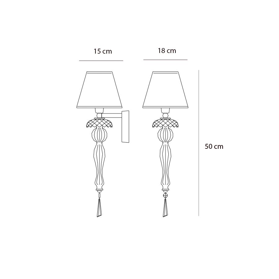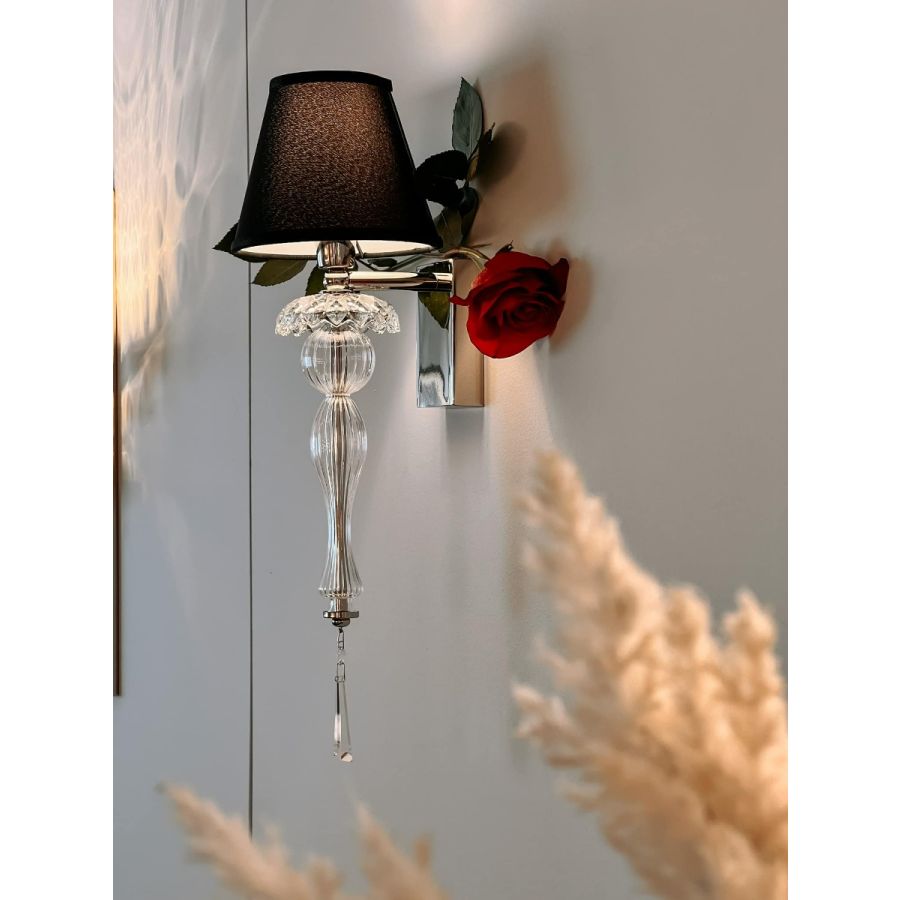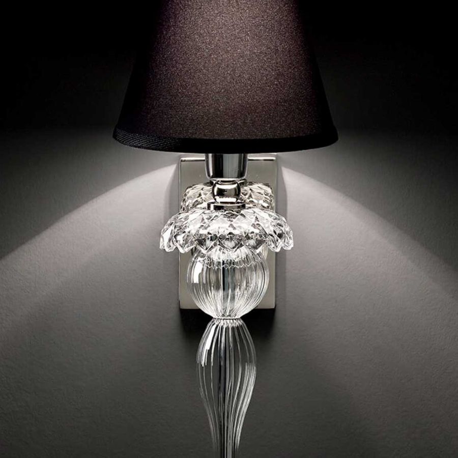 Wall lamp in carved crystal and glass, metal with nickel finish, black fabric shade and Swarovski elements pendants.