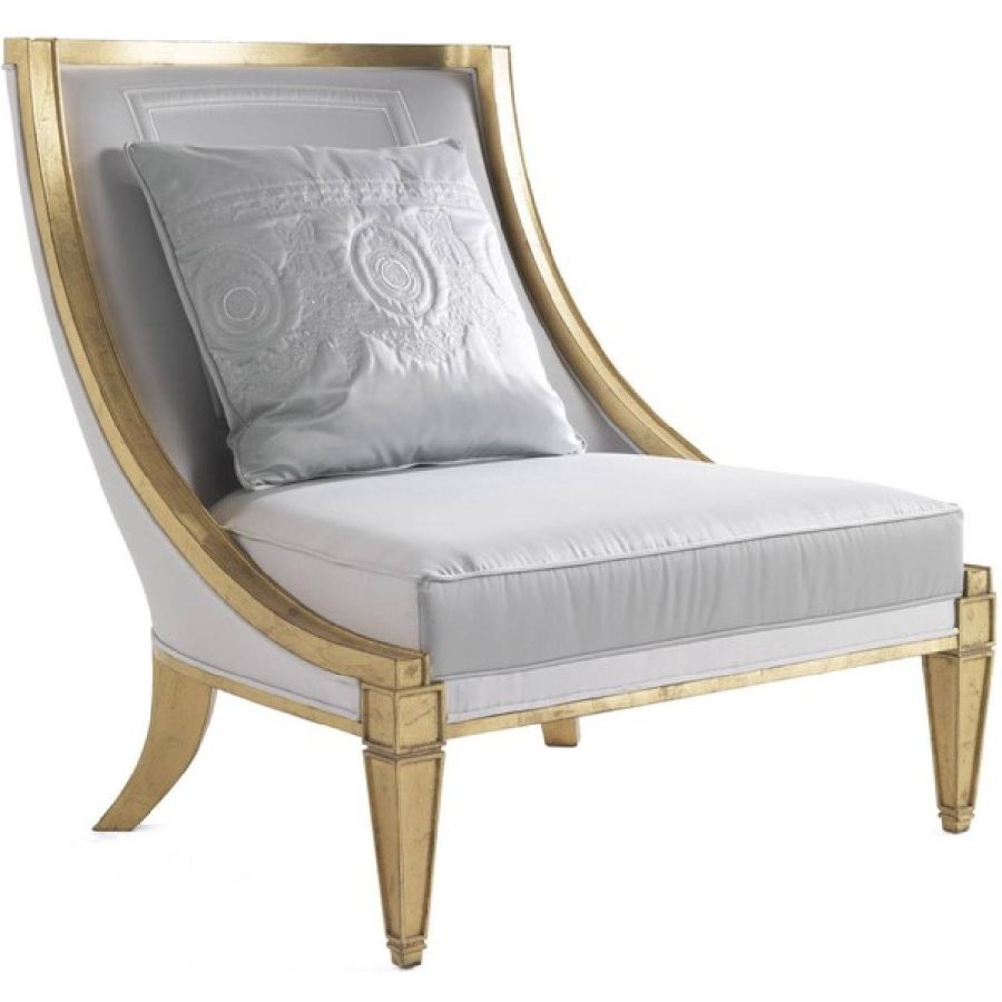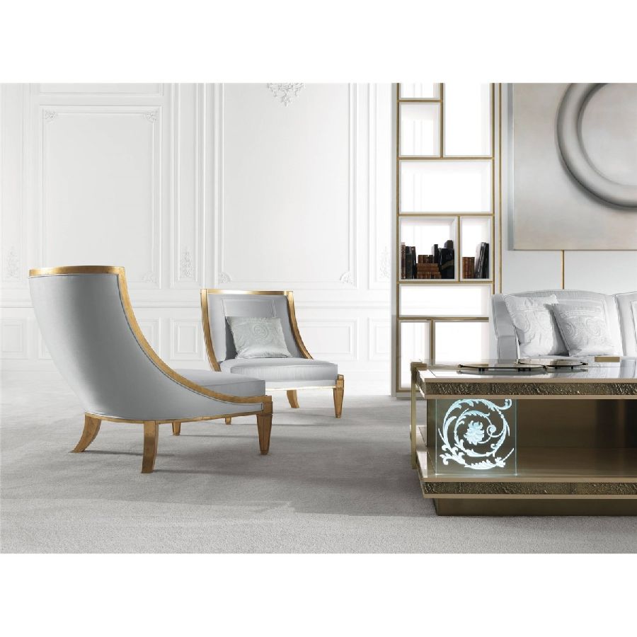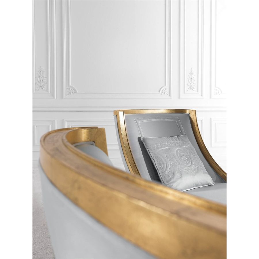 Fragonard line expresses Jumbo Collections design approach, where artisanal heritage, decorativism and experimentation in the use of materials, techniques and processes meet. In the Fragonard armchair, the base is highlighted by the very antiqued gold leaf finish while the shape of the armchairs is characterized by clean and essential lines, a confirmation of Jumbo Collections ability of mixing different inspirations and elements to create a unique and distinctive approach to classical style.