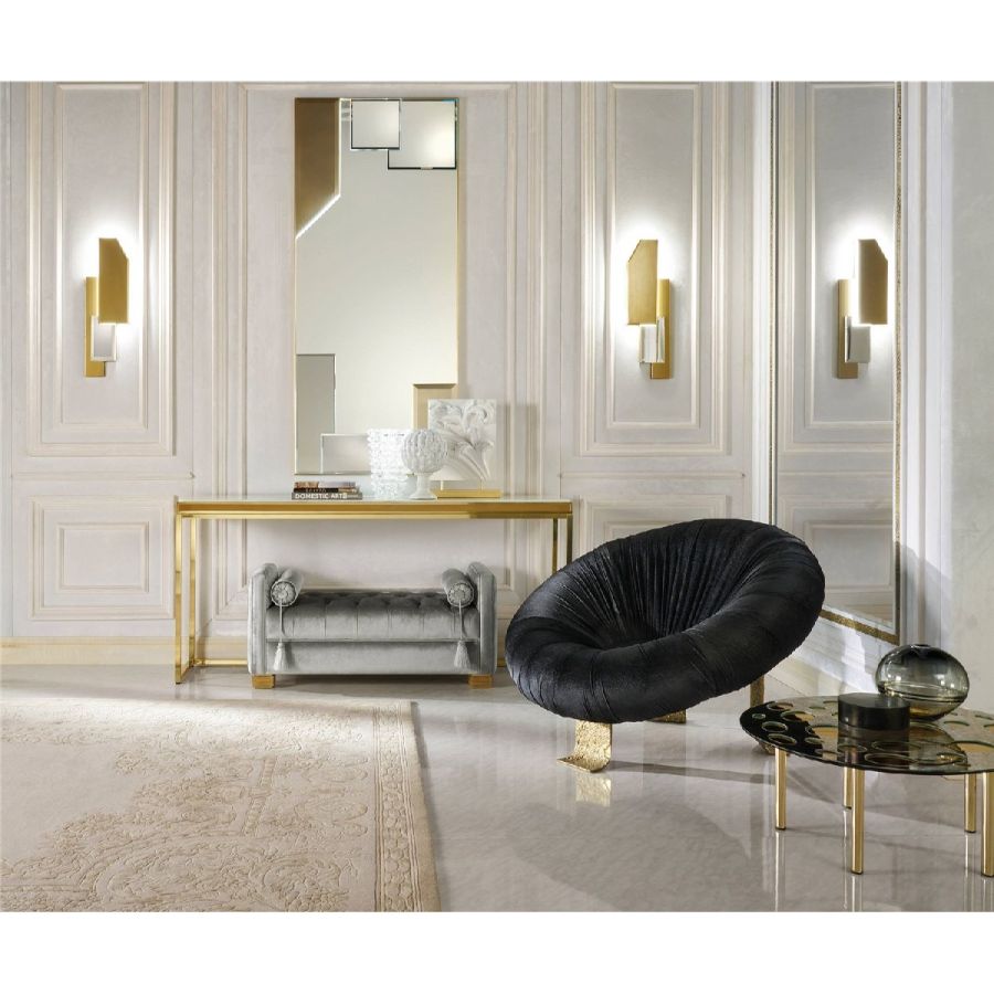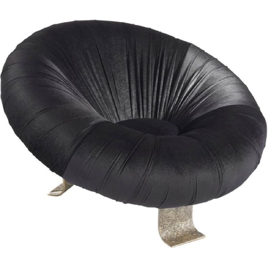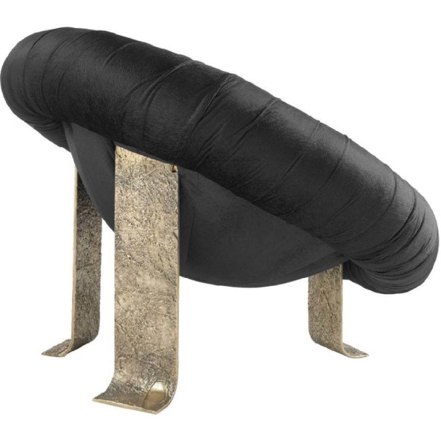 Behind its sculptural and scenographic appearance, Hawking armchair hides a complex process in terms of design and production. The contrast between the materiality of the support plates in brass casting and the sensuality and boldness of the black velvet that covers the seat helps to further characterize this original oval-shaped armchair, making it the undisputed protagonist of the environment in which it is inserted.