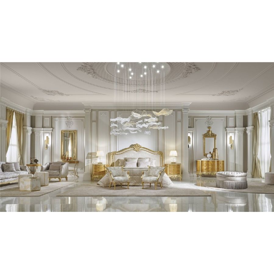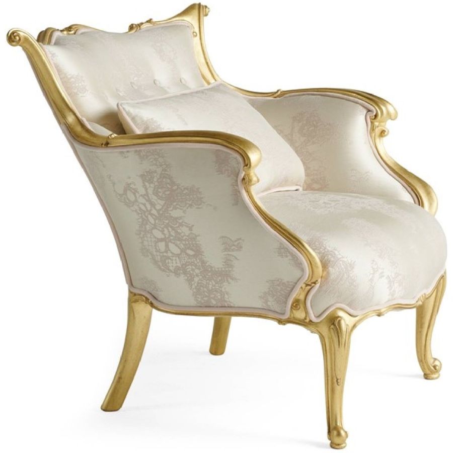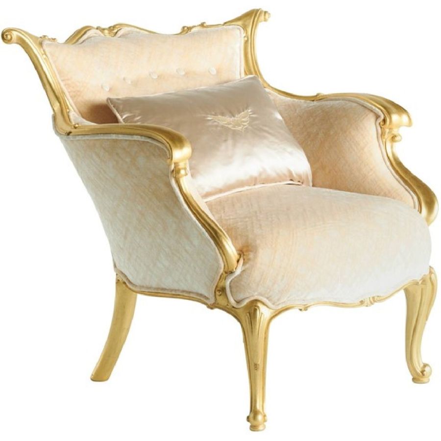 Regency is an elegant and comfortable armchair, whose name refers to the English style in vogue in the period that goes from the last years of the eighteenth century to around 1840 and which is characterized by the use of shapes and motifs that refer to the ancient world and to the Orient. The armchair features a hand-carved structure with a gold leaf finish and a delicate fabric upholstery.