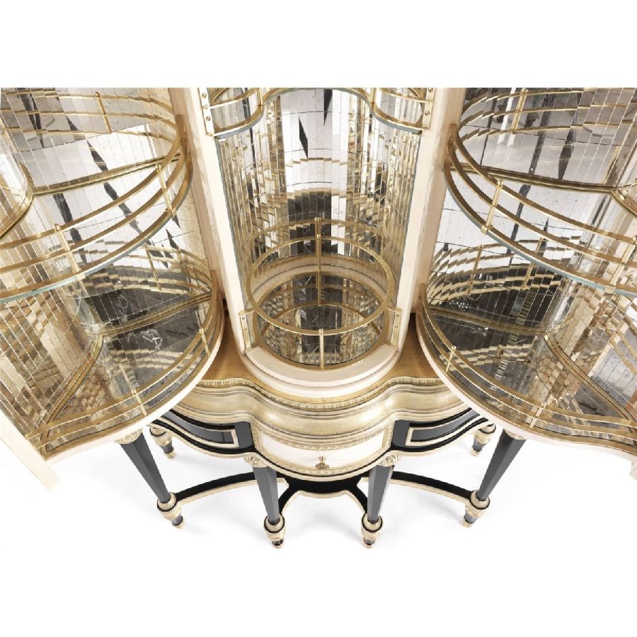 Impactful and impressive, Hypnos bar unit with external finishing in maple with sunburst carvings and antique gold-plating, features a special mechanism which synchronizes the opening of the lateral doors with the rotation of the central part, making the set scenographic and spectacular. The opening of the small door unveils the precious inside covered by cut mirrors with elements in brass.