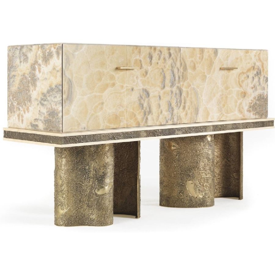 Characterized by sculptural shapes, the pieces of furniture of the Shinto line combine the essence of classic style with a contemporary allure. The pieces are distinguished by an original combination of materials, including natural maple, precious marble and brass casting. The parts in brass castings, with their materic appeal, contrast with shiny components in onyx or marble, enriched with refined decorations in gold leaf. All the pieces are characterized by an important artisanal component: the manufacturing mixes the use of experimental techniques with traditional methods handed down for centuries.