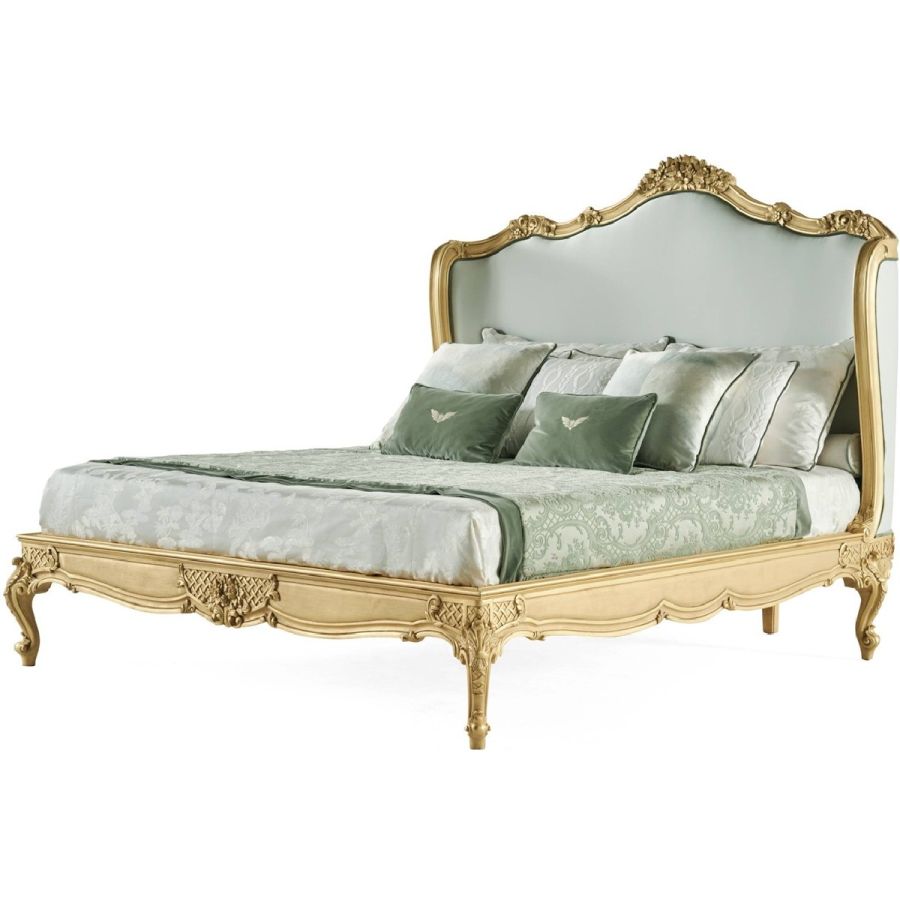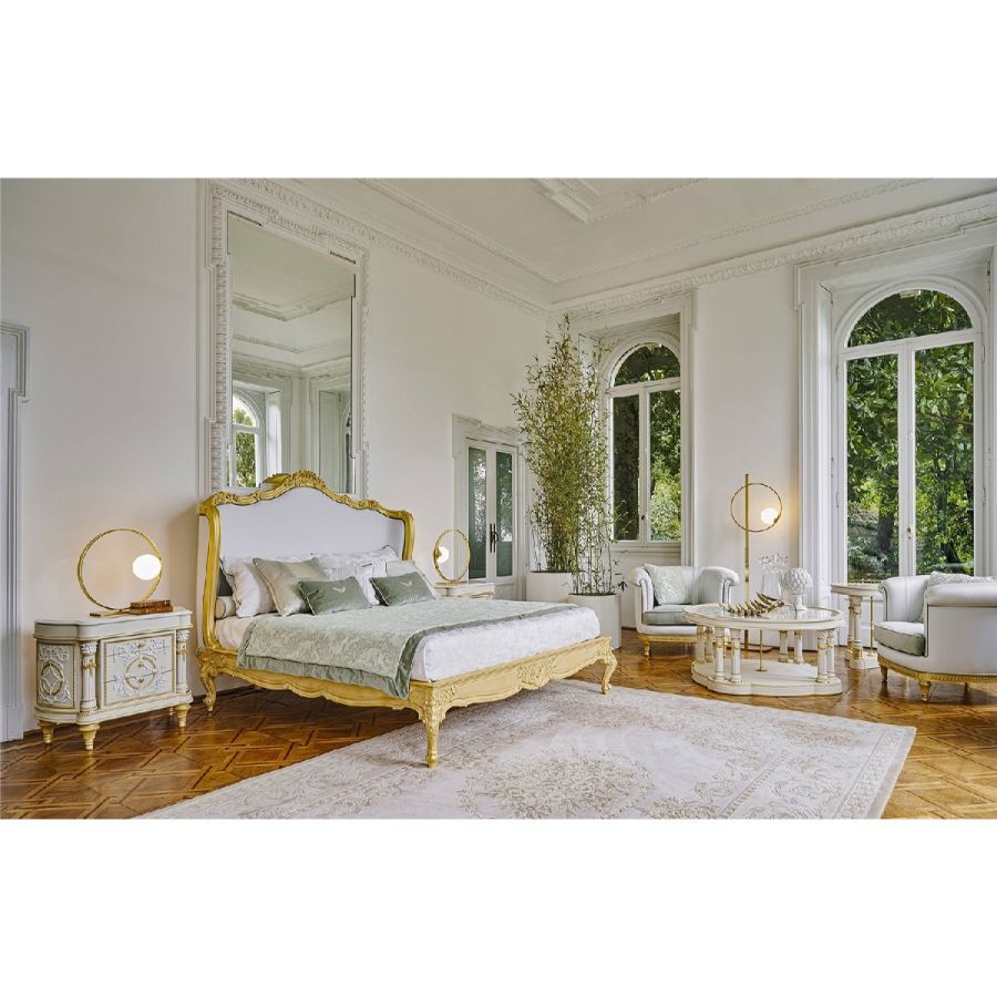 A perfect expression of a refined and luminous classic style, the Lgre bed brings an atmosphere of timeless elegance to the bedroom. A result of the artisanal mastery that has always characterized Jumbo Collection furnishings, the bed is adorned with luxurious details: the headboard and bed frame, crafted from hand-carved lime wood, are finished in antiqued gold with grey patina, adding a touch of sophisticated elegance. The fabric upholstery, completed with tone-on-tone piping, further enhances the design's refinement.