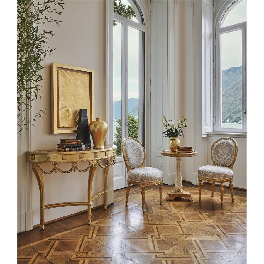 Dame is an elegant chair that showcases the luxury and craftsmanship of Jumbo Collection brand. Available with or without armrests, it features hand-carved legs with a gold leaf finish and is upholstered in exquisite fabrics from the collection, enhanced with velvet piping. A chair that adds a touch of classic elegance to any setting.