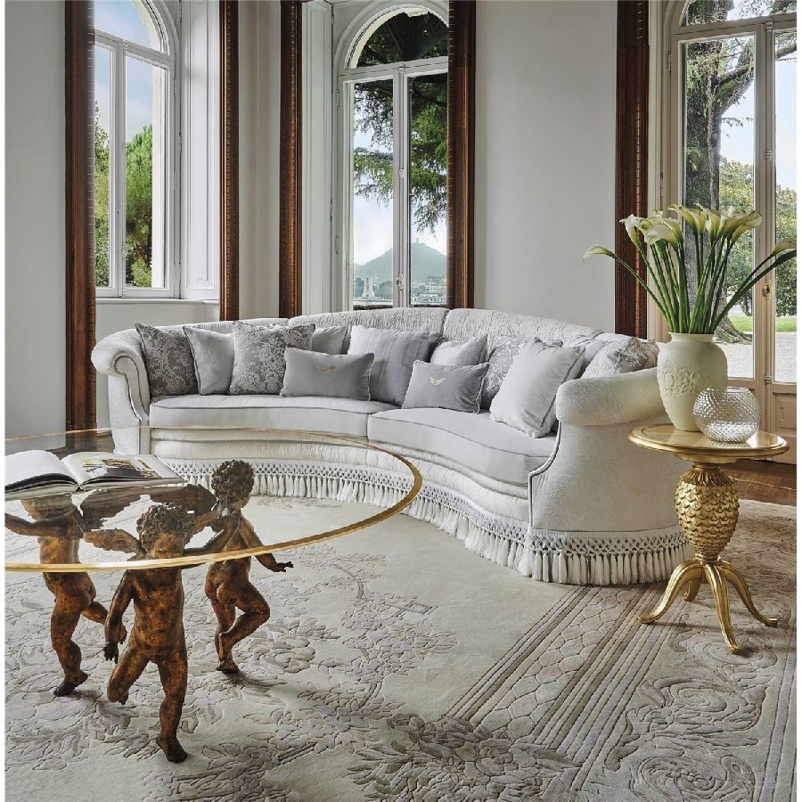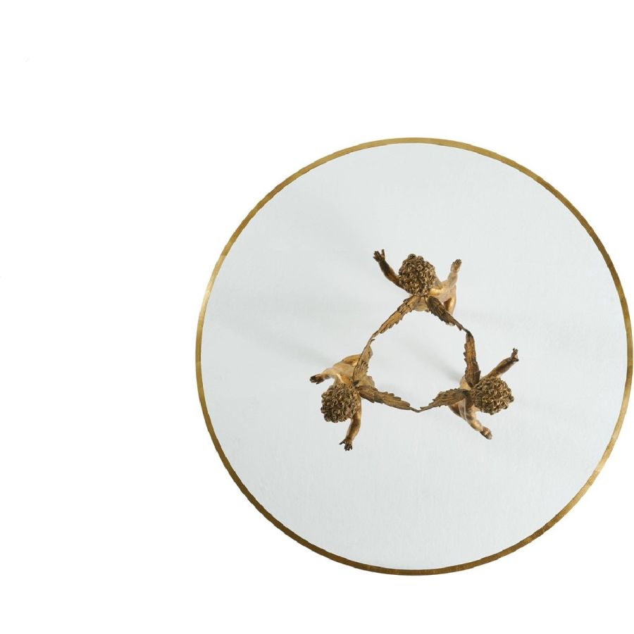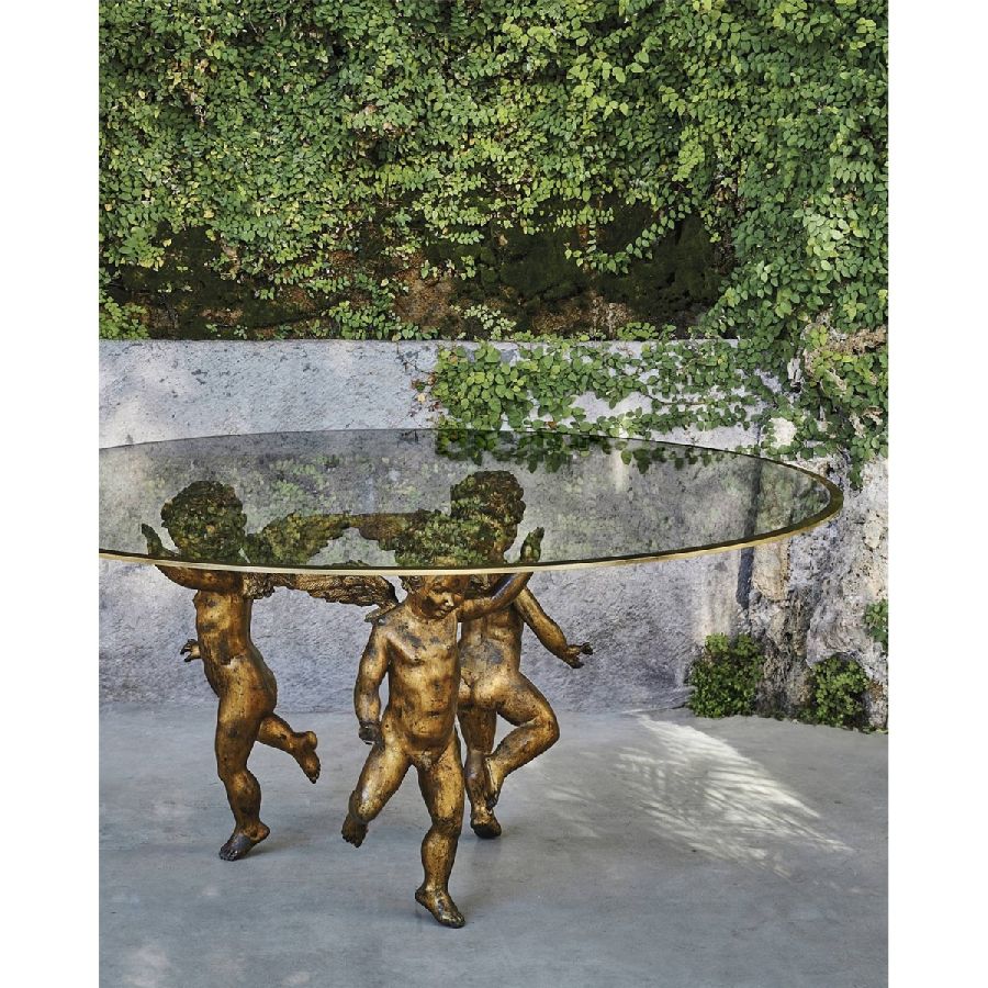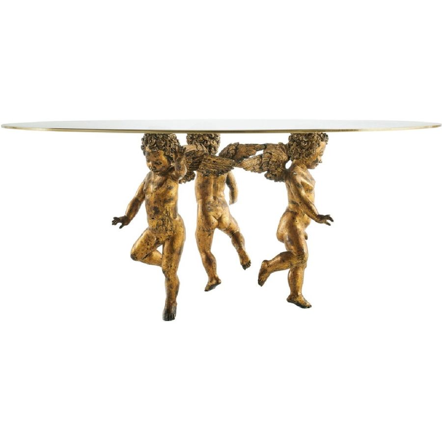 An elegant and prestigious central table, characterized by a sculptural base with three charming cupids made of brass casting, embellished with an antiqued patinated gold leaf finish. The top is made of extra-clear crystal, delicately framed by the gold leaf, adding a touch of brightness and refinement. A scenic table that embodies the essence of classic beauty and perfectly expresses Jumbo Collections timeless style.