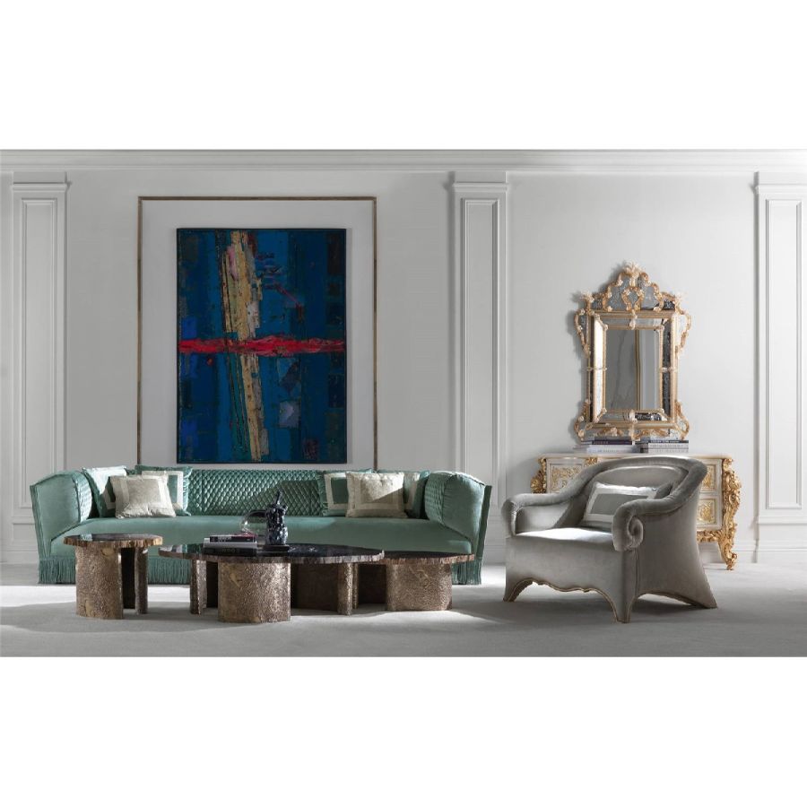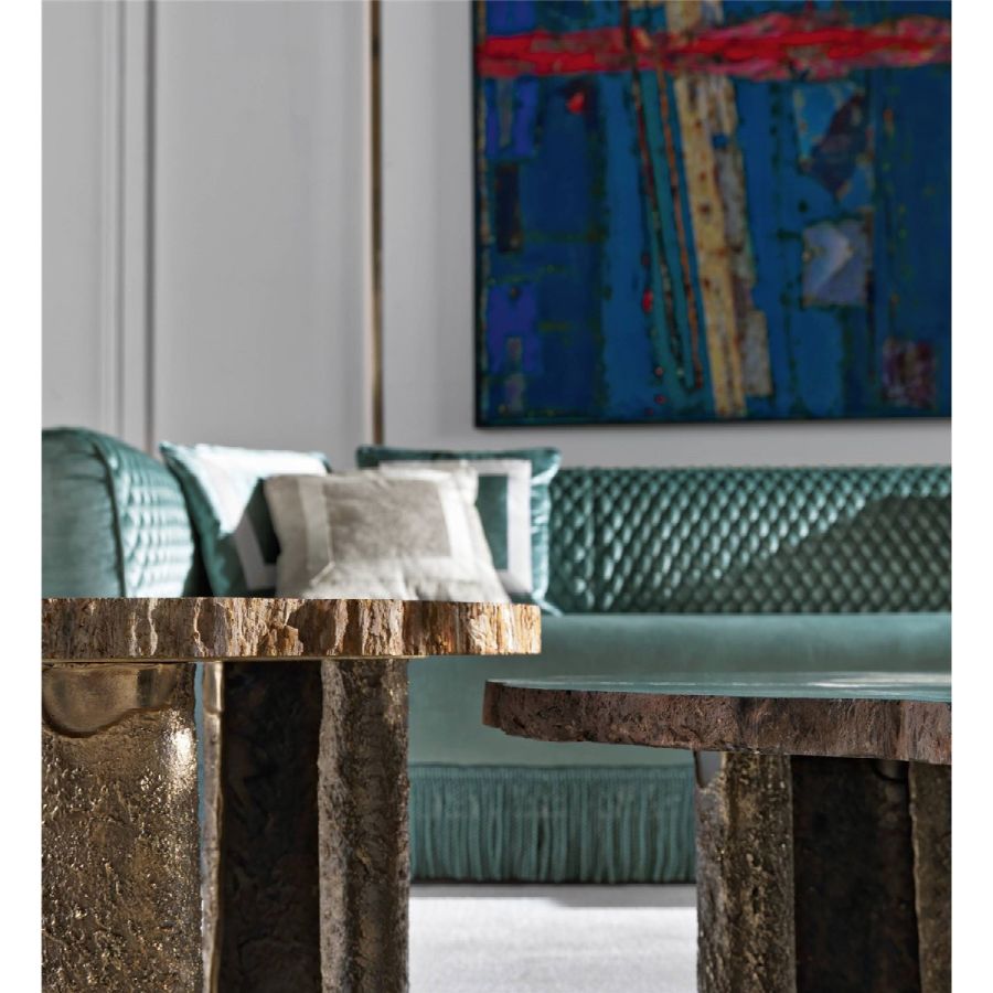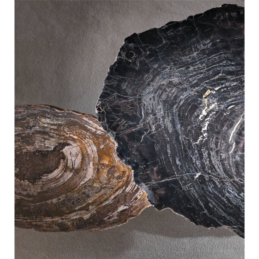 Echo is a coffee table with material beauty. A one-of-a-kind composition that combines the charm of distant lands with contemporary shapes to create an exclusive sculptural piece of furniture. The top is made of precious fossil wood, while the base is made of brass, obtained through skilled craftsmanship.