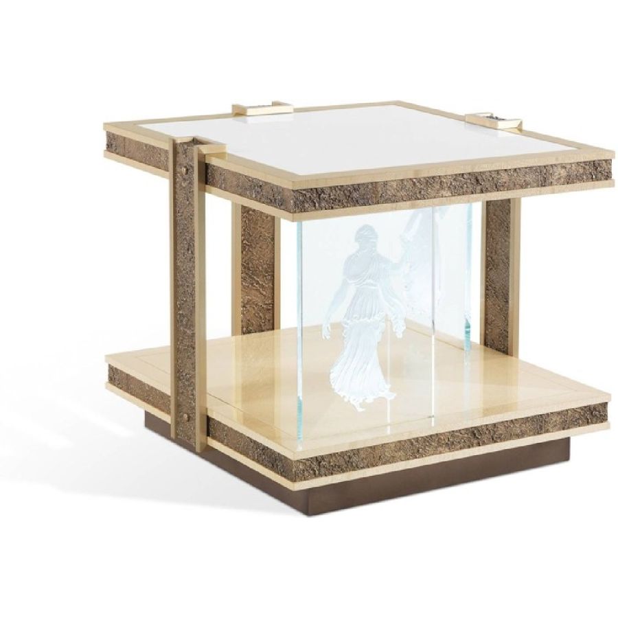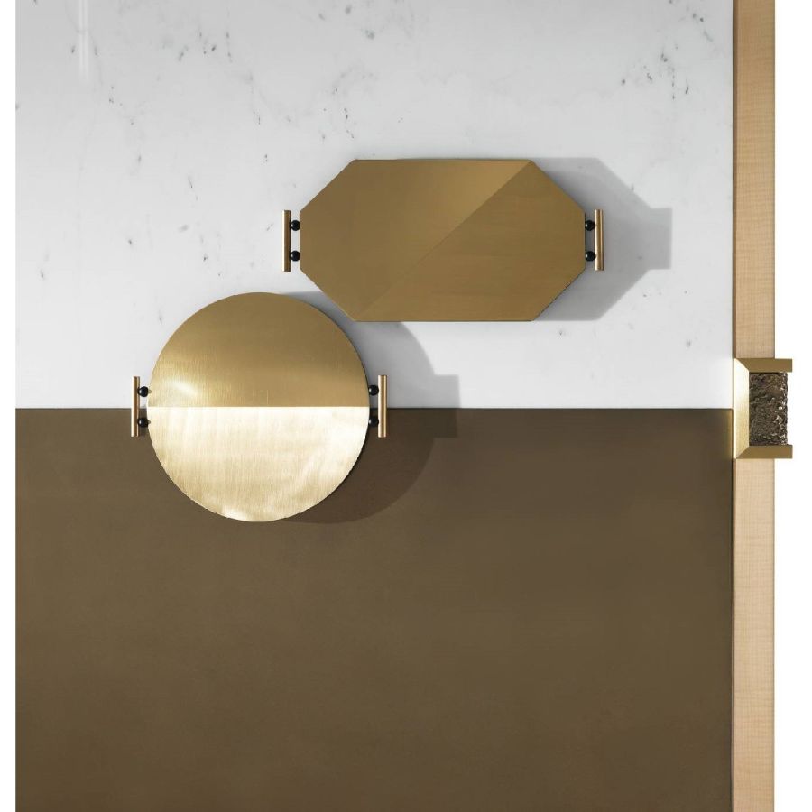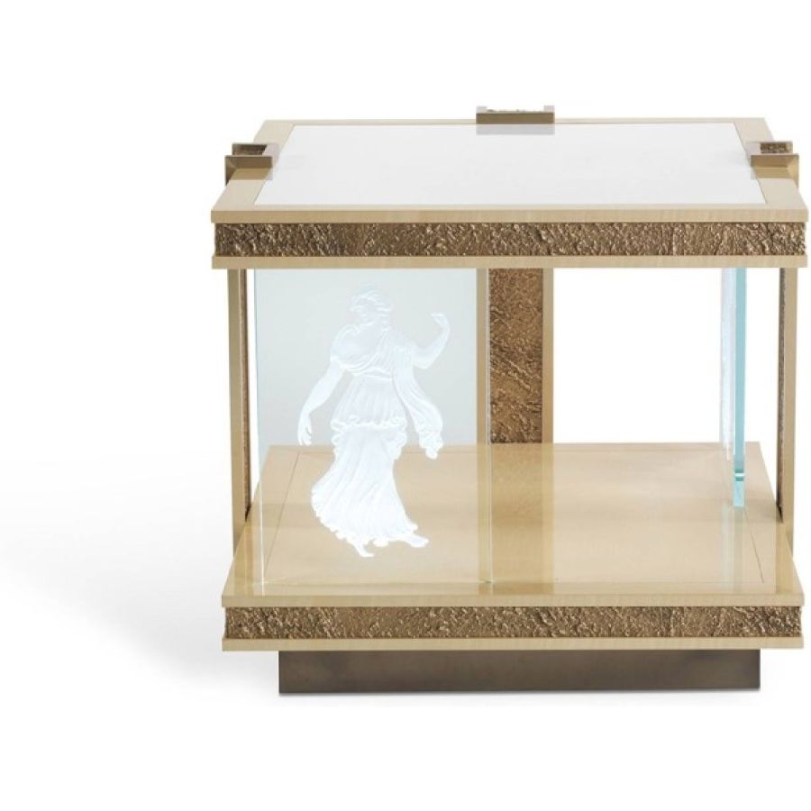 Characterized by sculptural shapes, the furniture of the Shinto line combine the essence of classic style with a contemporary allure. They are distinguished by an original combination of materials, including natural maple, precious marble and brass casting. The parts in brass castings, with their materic appeal, contrast with the shiny component in onyx or marble, enriched with refined decorations in gold leaf. All the pieces are characterized by an important artisanal component: the manufacturing mixes the use of experimental techniques with traditional methods handed down for centuries.