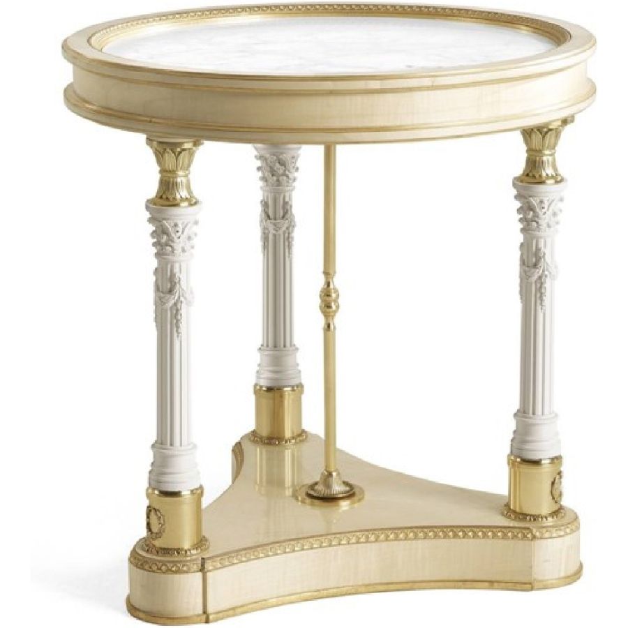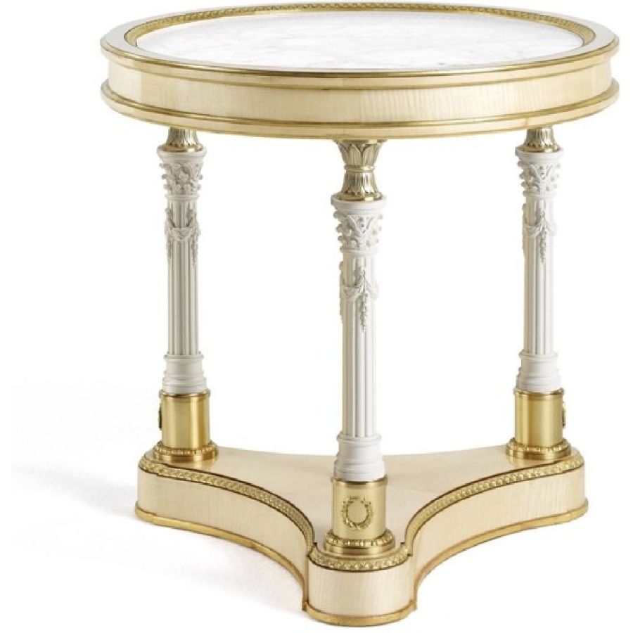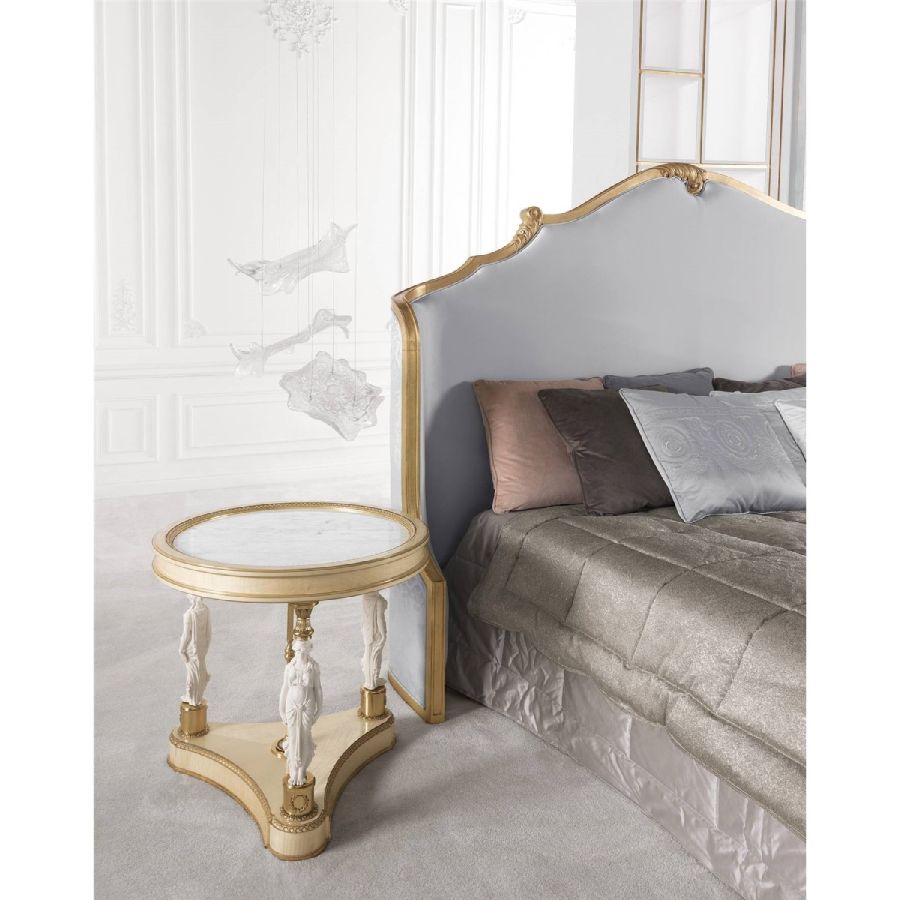 A bright and clean classic style with a western-inspired decorative spirit: the Toulouse line, composed of side table, central table, night table and chest of drawer, with gold leaf details perfectly expresses Jumbo Collections decorative spirit, through a wise combination of quality materials and high level of craftsmanship. The main feature of these elegant pieces is the presence of columns or caryatids, sculpted female figures of classic inspiration, made of porcelain with biscuit finish, lending the sculptures a matte appearance and texture to the touch.
