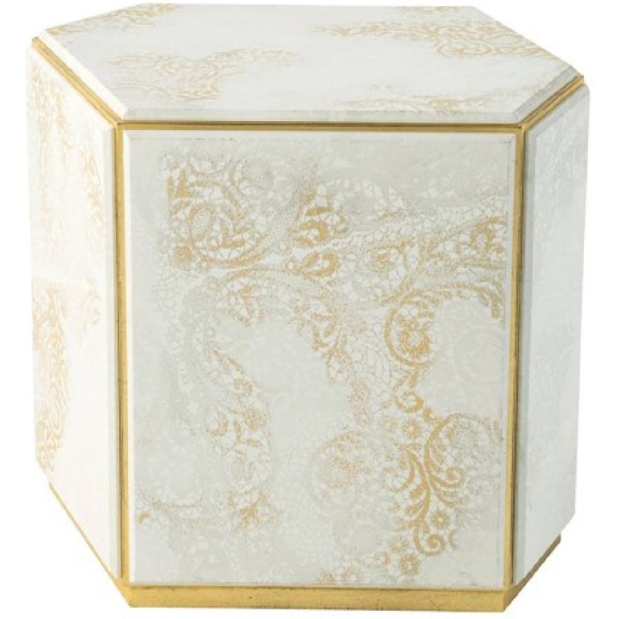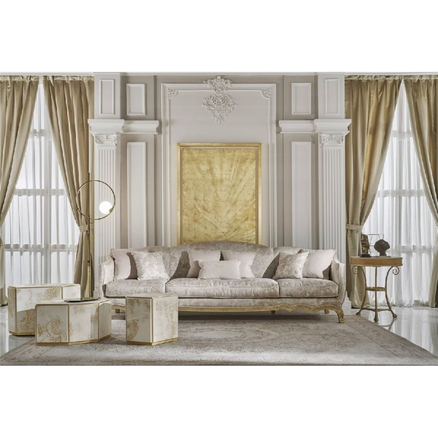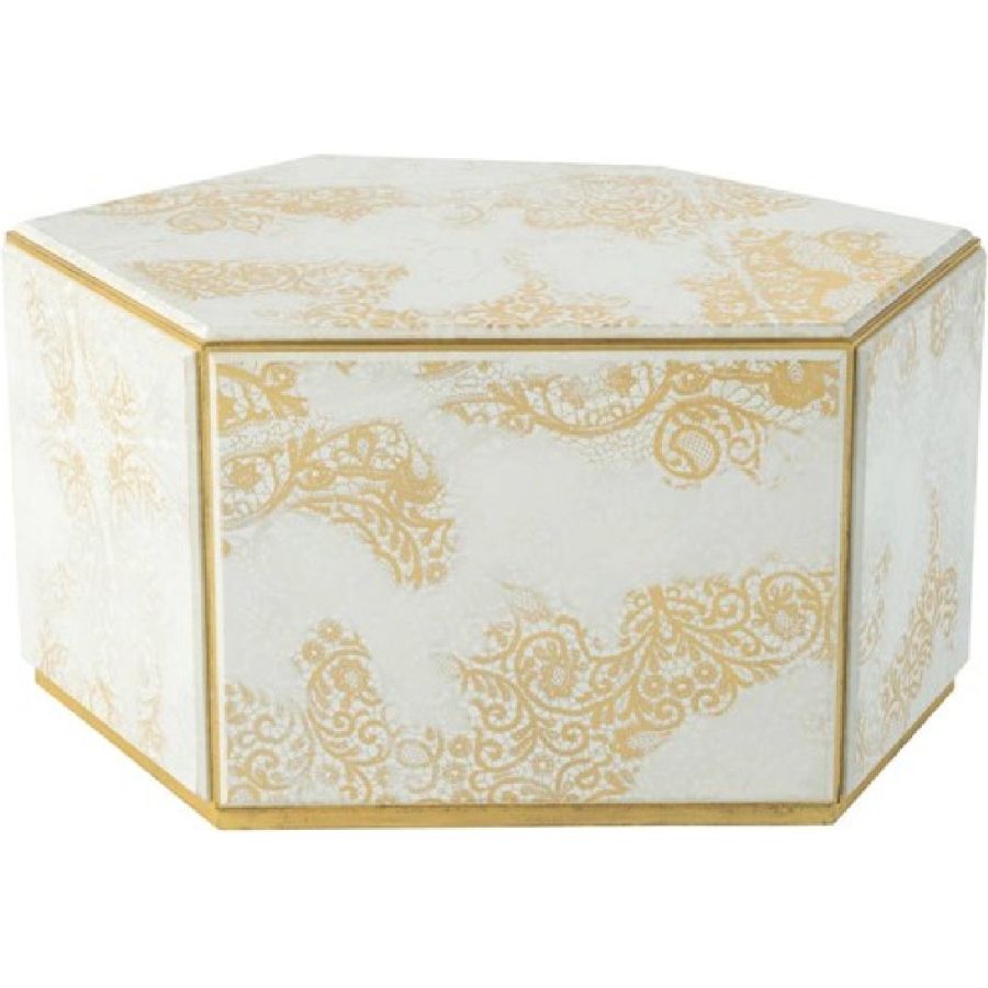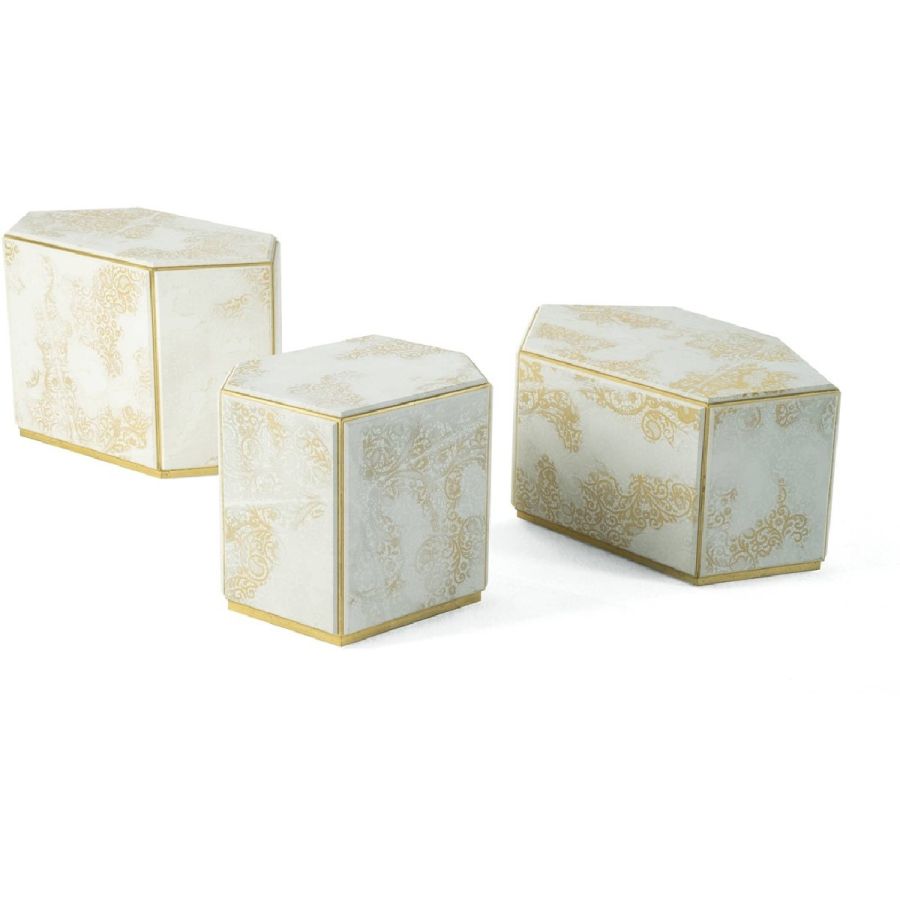 Trs Jolie hexagonal coffee tables, available in different sizes, allow the creation of original and functional compositions. The tables are characterized by the presence of panels with lacquered finish and decorations that refer to the art of lace, obtained through a special laser process that allows the upper layer of lacquer to be engraved to obtain the design.