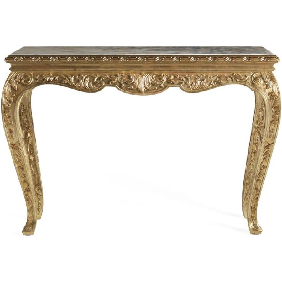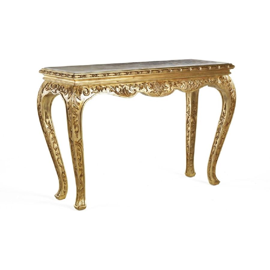 Fragonard line expresses Jumbo Collections design approach, where artisanal heritage, decorativism and experimentation in the use of materials, techniques and processes meet. In the console, the Baroque-style base with carvings in low relief and a very antiqued gold leaf finish is combined with a top in onyx or precious marble.