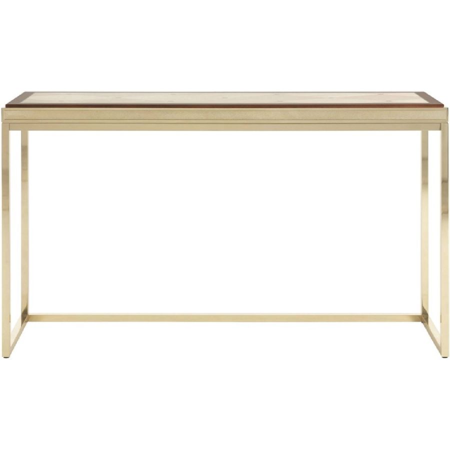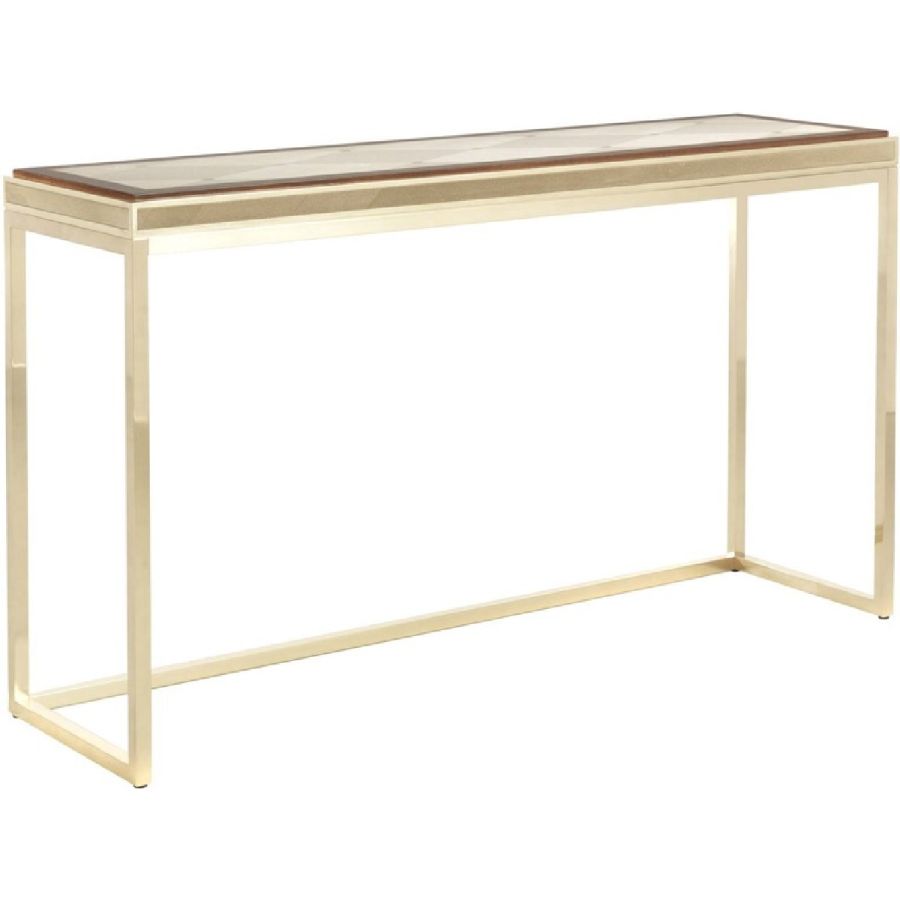 In the Hudson console, the light, slim and elegant design dialogues with the presence of precious materials and refined workmanship. An original aesthetic, with a timeless classic style, which is expressed in the combination of the glossy brass structure with engraved frame and the walnut top with natural maple and brass inserts.