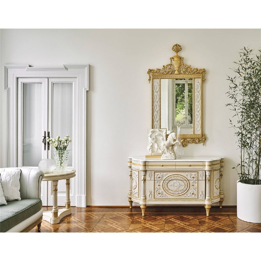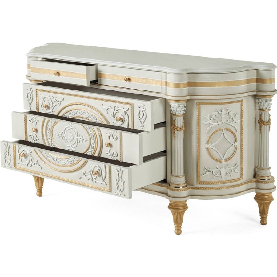 Bohme is a three-drawer chest that embodies the refined and elegant classic French style. Its structure, in white and grey lacquered wood, is enriched with carved decorative elements and antiqued gold details with patina, which confer a sophisticated nobility to the piece. The neoclassical columns add a touch of elegance, while the top in white Namibia Rhino marble completes the design with a timeless note of luxury. Bohme is the perfect expression of craftsmanship and style, ideal for enhancing any space with its distinctive presence.