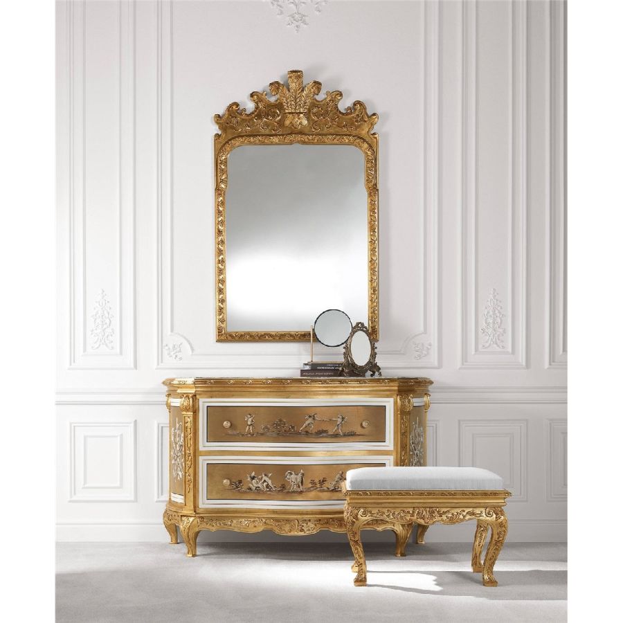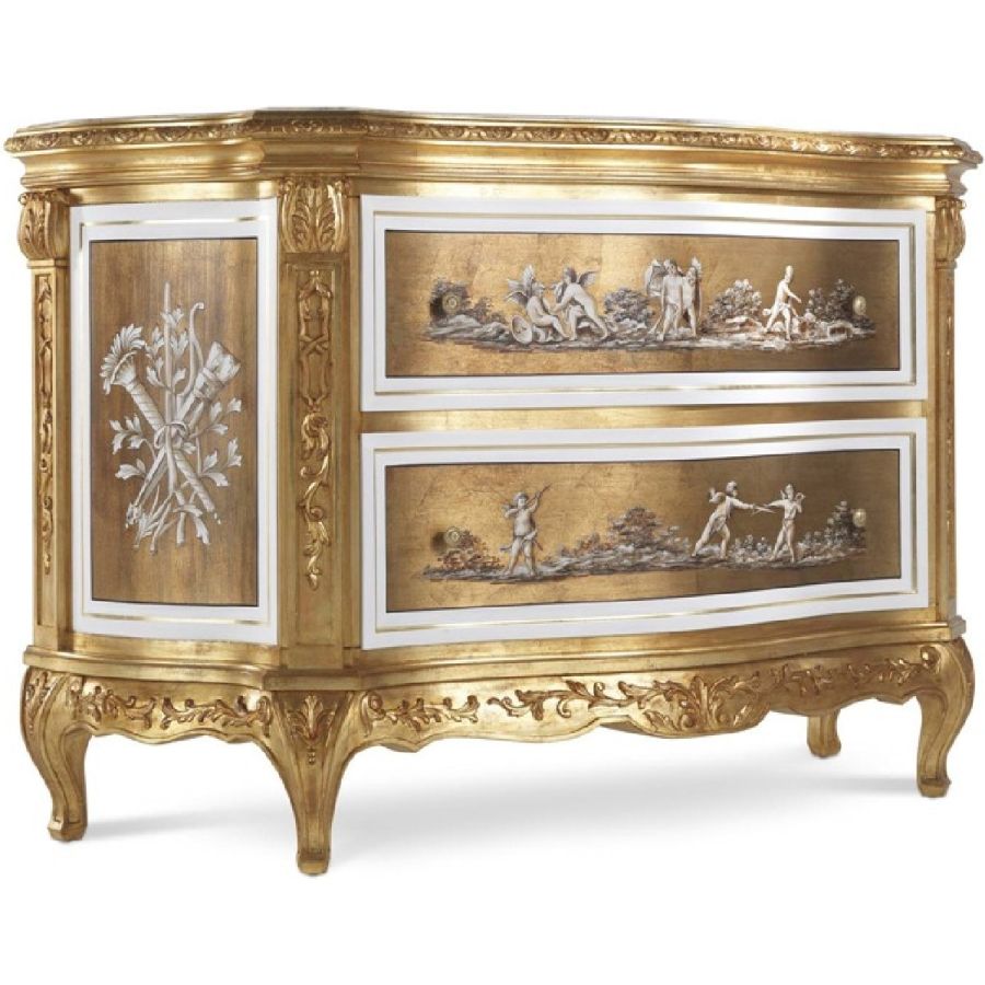 A line of furnishings in Baroque style, perfect expression of Jumbo Collection's decorative spirit and craftsmanship heritage. The chest of drawers is characterized by a beechwood structure with low-relief carvings finished in antique gold leaf with white and gold decorations inspired by neoclassical tradition, while the top is in precious onyx.