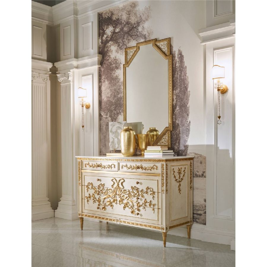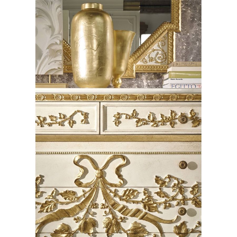 A refined and elegant classic French style for the Rubanier drawer unit. The piece of furniture is characterized by a patinated white lacquered wooden structure, enriched by decorative elements of Renaissance inspiration, hand carved and finished in gold leaf. The Namibia Rhino marble top completes the whole with a precious and luminous touch.