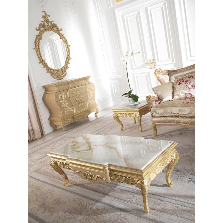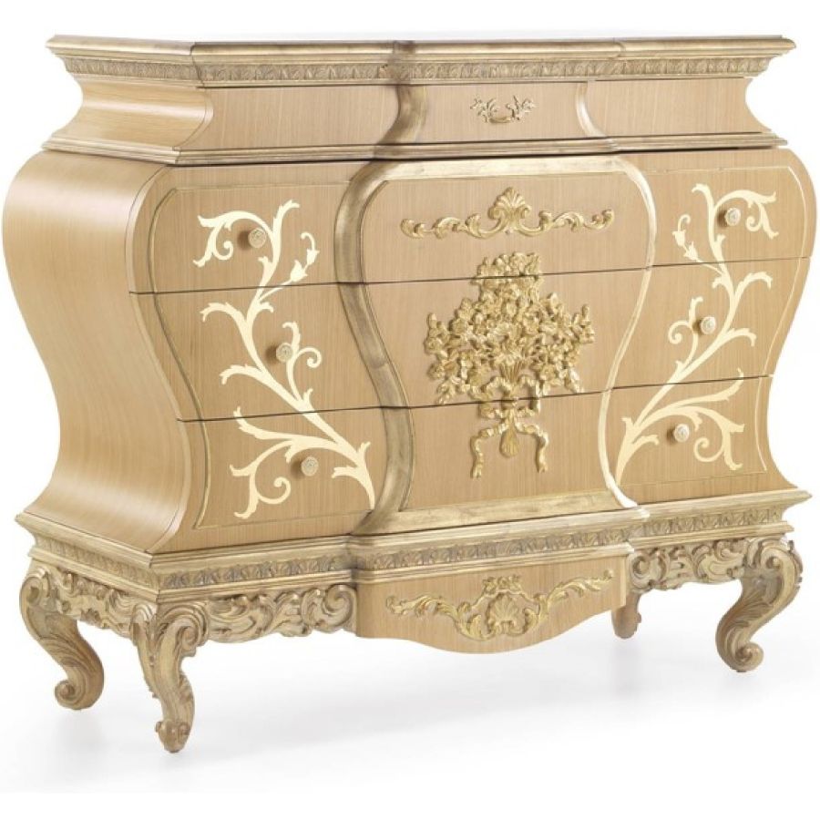 Scarlett is a line of refined Louis XV style pieces of furniture. Characterized by sinuous curved lines, the chest of drawer of the collection features a structure with light oak finishing and gold decorations which enhance the setting lending the piece of furniture an high decorative and artisanal value.