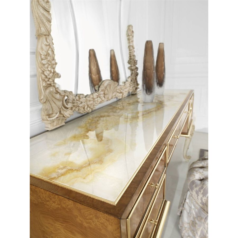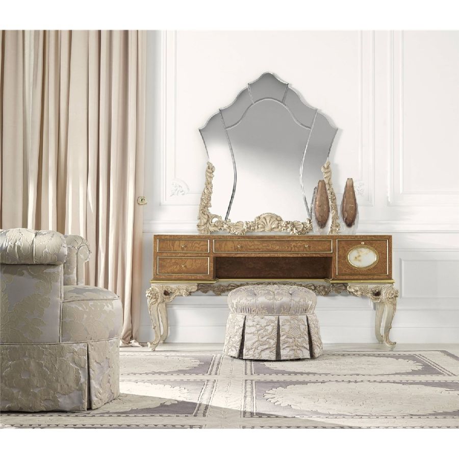 Elegant, luxurious and timeless, La Grande Dame furniture line is a tribute to the most authentic classic style. The dressing table is characterized by a precious hand-carved beechwood base in Louis XV style with finish in walnut and patinated white and gold. The structure is in walnut with brass inlays and marble inserts, like the top.