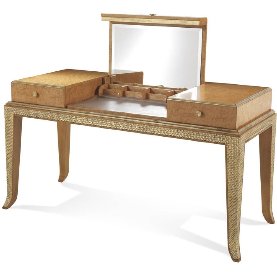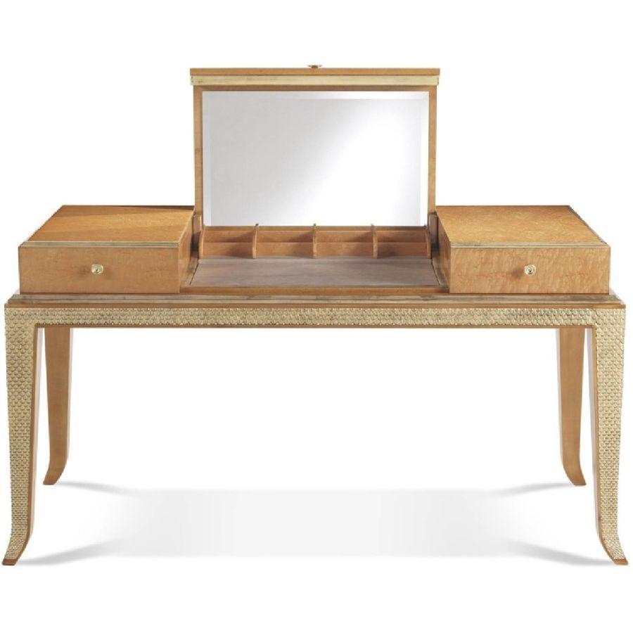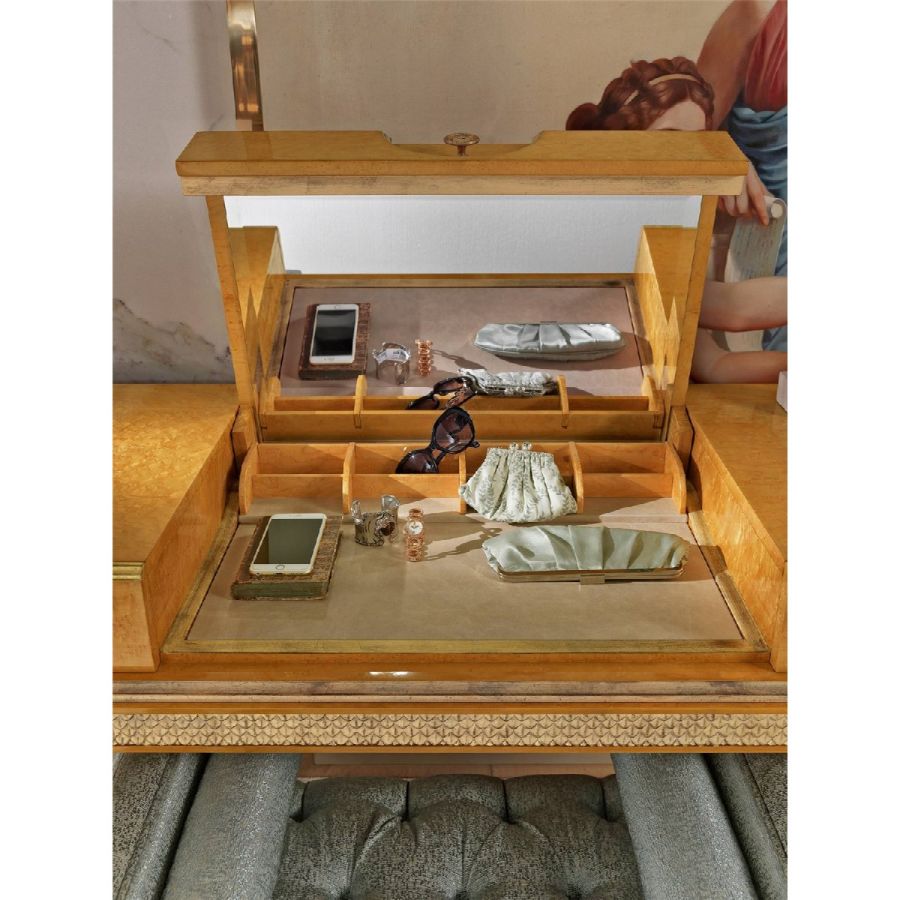 Pleasure is a line of furnishings with linear and essential shapes, characterized by an elegant and refined charm. The dressing table of the collection, in deco style, features a structure in maple with glossy finishing, details with antique gold finishing and marble top. The central compartment with mirror features an inner upholstery in leather.