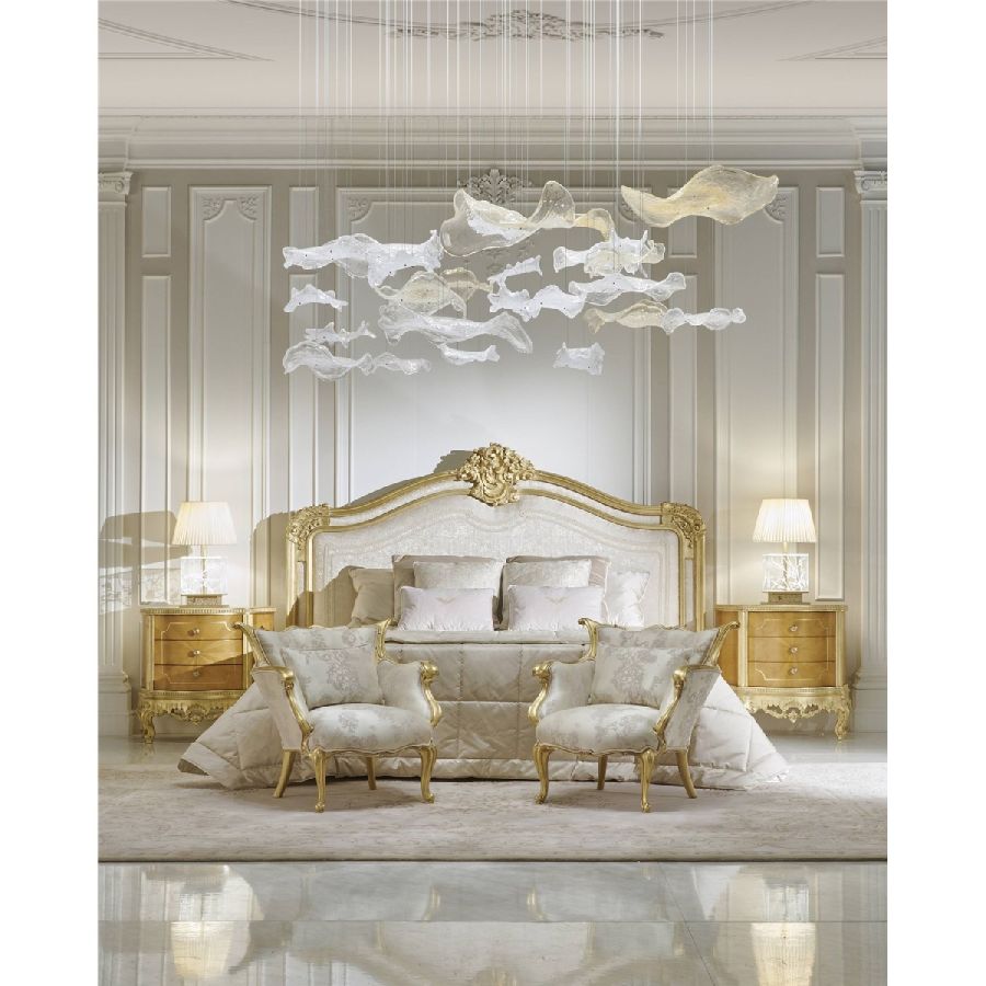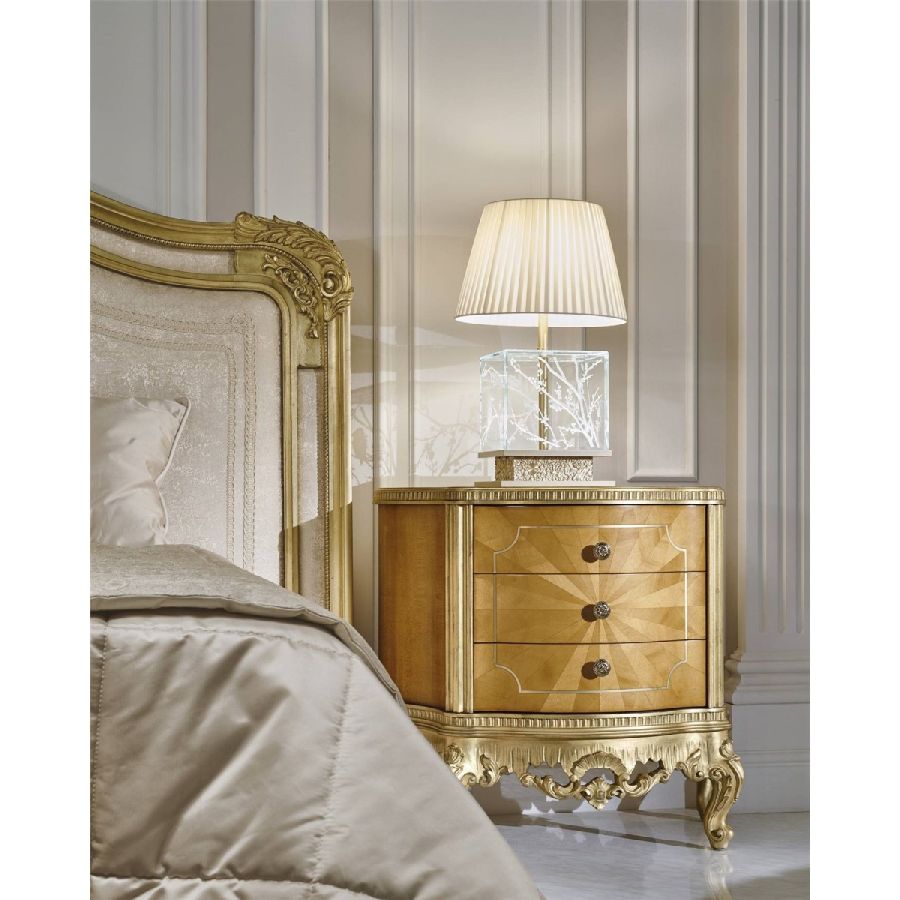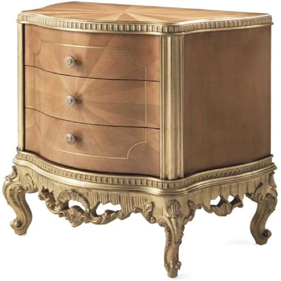 Ourlet is a line in a classic French style, expressing the refinement of the Italian artisan tradition. Made of maple, dyed in an elegant slightly darker shade, it features light and bright decorative brass inserts and it is enriched by sophisticated hand-carved bases with gold leaf finish. These pieces are perfect for a bedroom with a royal and fairy-tale atmosphere.