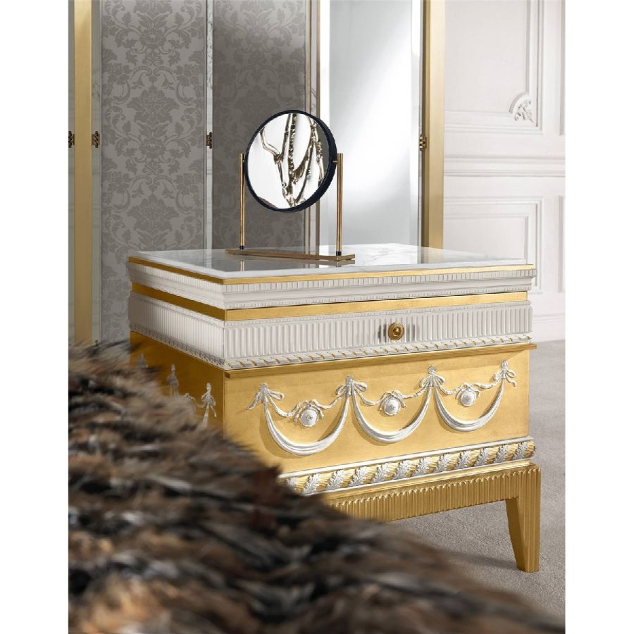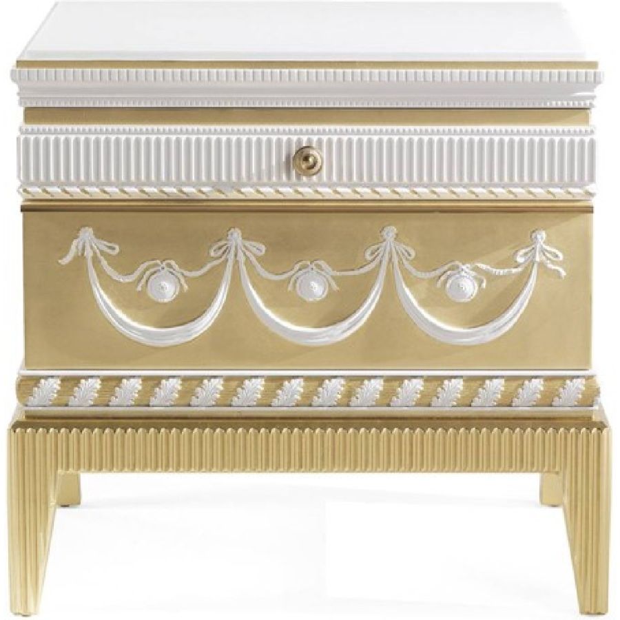 Portland is a delicate and refined line of furnishings, characterized by decorations that recall the world of Wedgwood ceramics. The ornaments with a classic charm are further enhanced by the lacquer finish with biscuit porcelain effect which lends the designs an opaque and rough effect, while the glossy opaque gold leaf gilding further enriches and enhances the pieces of the line.