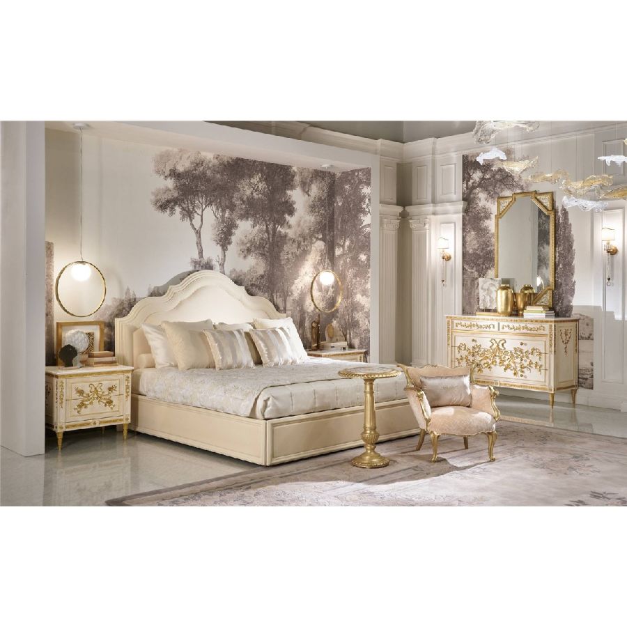 A refined and elegant classic French style for the Rubanier night table. The piece of furniture is characterized by a patinated white lacquered wooden structure, enriched by decorative elements of Renaissance inspiration, hand carved and finished in gold leaf. The Namibia Rhino marble top completes the whole with a precious and luminous touch.