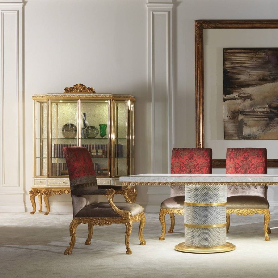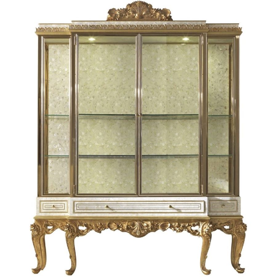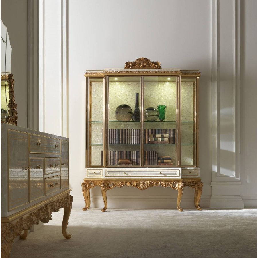 A refined combination of styles and precious materials gives life to a showcase with a great visual impact. Coquille is characterized by a structure in wood and mother of pearl with hand-made gold decorations. The base is hand-carved, the doors are made of glass and the back is in mother of pearl. The result is a scenographic piece suitable for settings with a classic and luxurious charm.