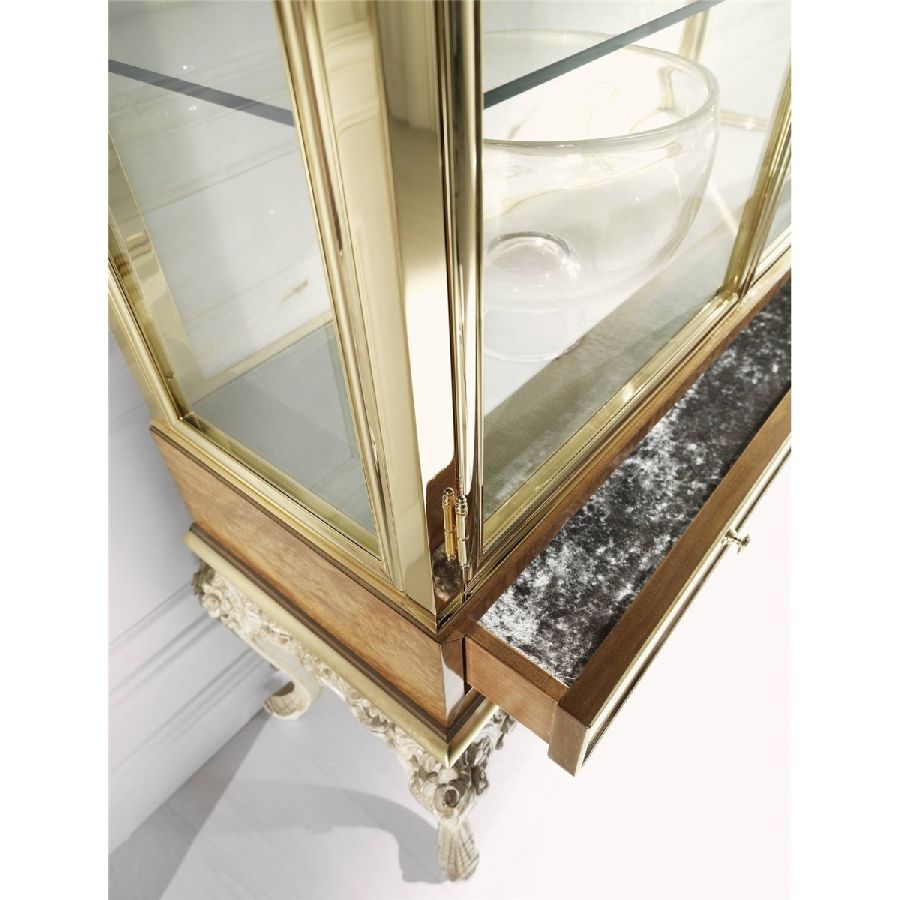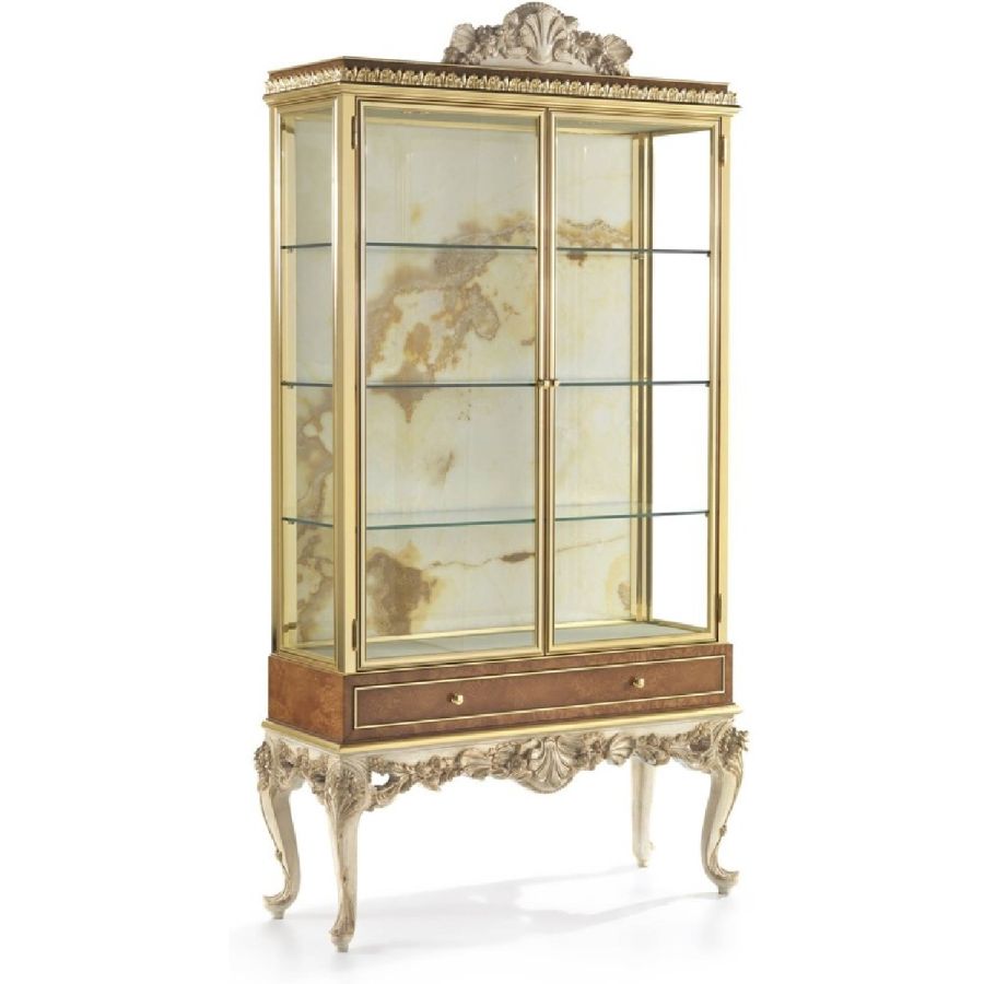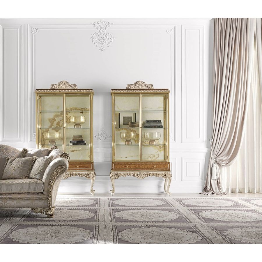 Elegant, luxurious and timeless, La Grande Dame furniture line is a tribute to the most authentic classic style. The showcases of the line are characterized by a precious hand-carved beechwood base in Louis XV style with finish in walnut and patinated white and gold. The structure is in walnut while the back is in onyx.
