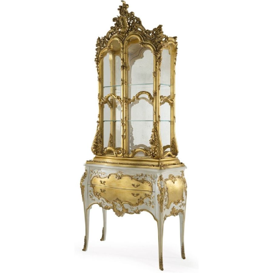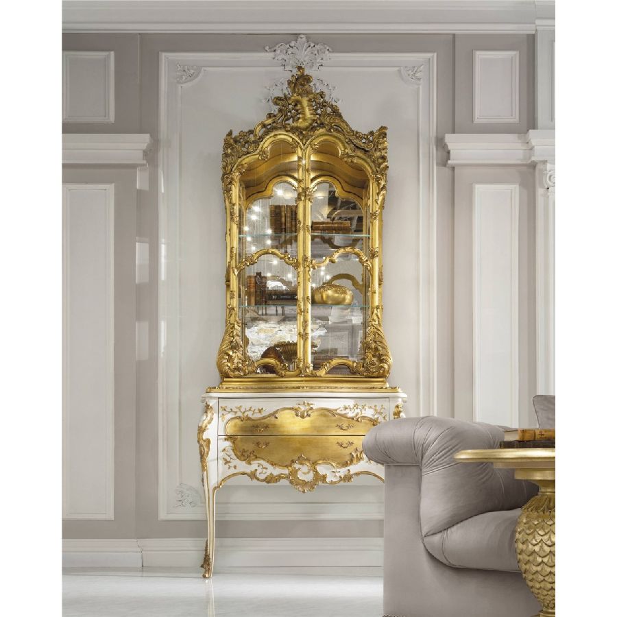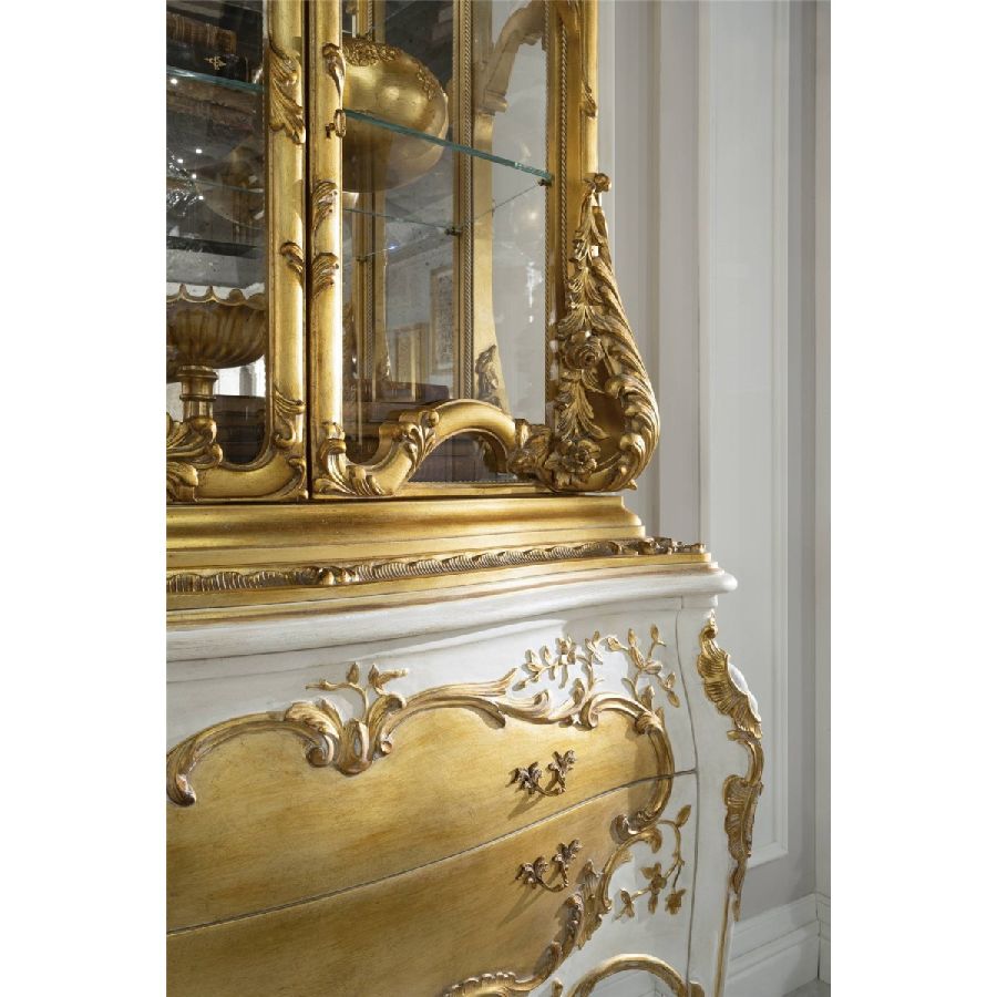 A jewel furniture, finely carved, pure expression of the best Italian craftsmanship. With Palais Royal, Jumbo Collection reinterprets the most authentic classic style, creating a piece of furniture able to conquer with its scenographic presence. The showcase features a white lacquered finish with gold leaf details. The lower part has two drawers, while the upper part has two glass doors. The interior is covered in antique mirror.