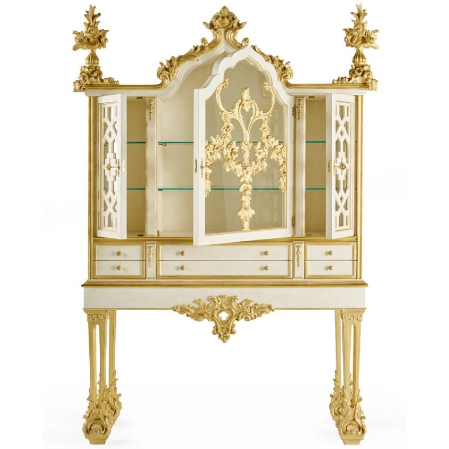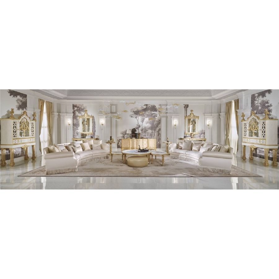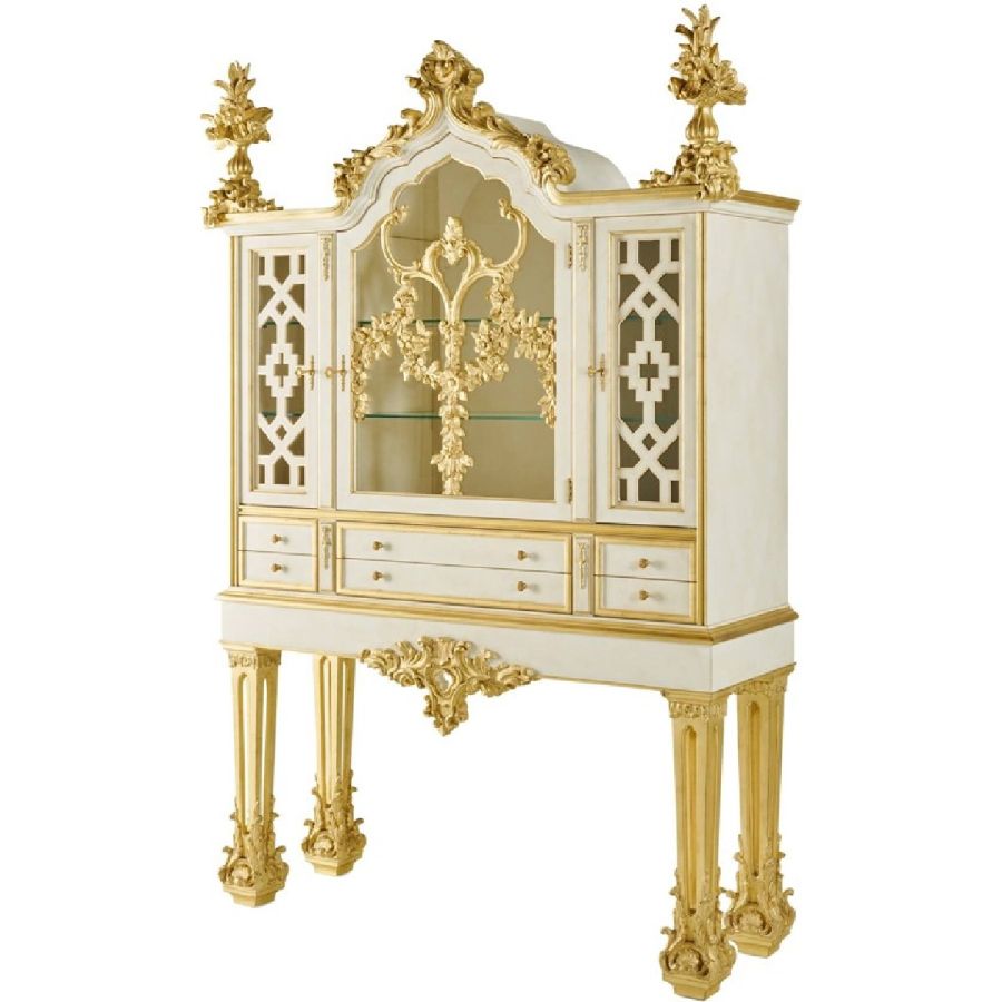 Radiating opulence and regal splendor, the Regency showcase commands attention with its majestic presence. It boasts a white lacquered structure adorned with hand-carved details, further enhanced by the exquisite touch of gold leaf finishing. Featuring six drawers and three doors, its interior showcases crystal shelves, while decorative cimases adorn the top, adding an extra layer of grandeur to this magnificent piece.