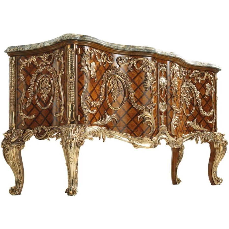 Jumbo collection has revived this historic piece of art, a commode-mdaillier created by hand by italian craftsmen, with marble top, an elaborate parquetry inlaid with geometric designs, and lost-wax casted bronzes marvelously chiseled and then gilded. In the new edition of Fontainbleau, on the two central doors the mythological figures inside the oval medallions have been replaced with light floral decorations.