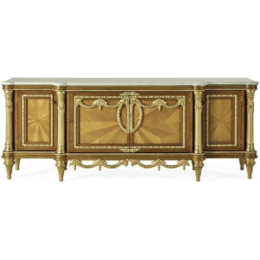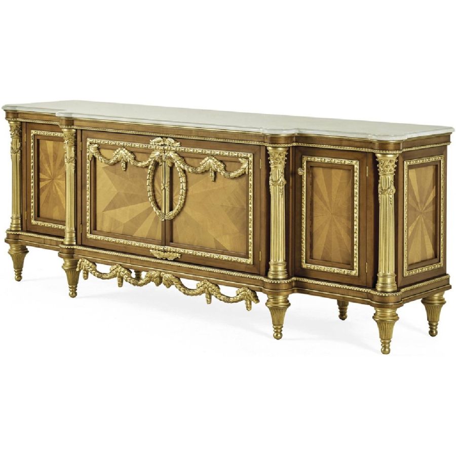 The Guirlande sideboard, crafted in dark-stained maple wood, is distinguished by its finely carved garlands and columns, enhanced by gold accents. The sunburst veneer pattern highlights the depth of the wood grain, while the Namibia marble top adds a touch of tasteful monumentality. Inside, practical shelves complete this piece designed to celebrate beauty in all its forms.