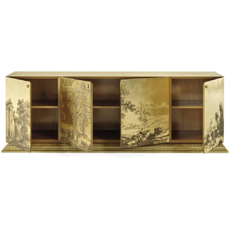 The sideboard from the Idylle line blends artistic expression with enduring luxury. Its structure boasts a luminous laser-engraved gold finish that reveals a delicate lithograph of a pastoral landscape in warm, glowing tones. A hand-carved base, refined with antique gold leaf, underscores its classical inspiration and adds further complexity to the piece. More than just furniture, Idylle is a true statement of poetic elegance.