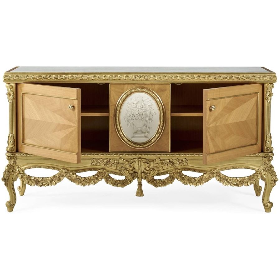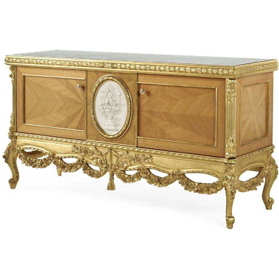 The Mdaillon sideboard exudes noble grandeur and artisanal mastery. It features a refined structure veneered in rich American walnut, with the base and decorative elements elegantly finished in gold leaf. The centerpiece is a hand-carved wooden medallion in classic style, adorned with a distinctive chalk-effect lacquer. Inside, practical shelving provides ample storage space. The top is crafted from Namibia Rhino marble, framed by a delicately hand-carved wooden profile. This piece makes a luxurious addition to any interior.