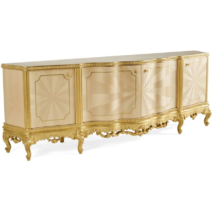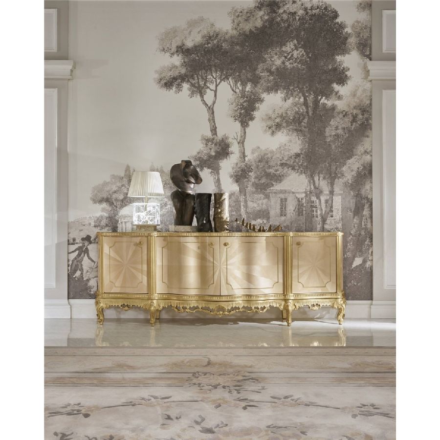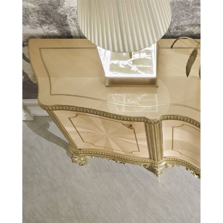 Ourlet is a line of furniture in a classic French style that expresses the refinement and elegance of the art of cabinet-making and of the Italian artisan tradition. The structure and top are in wood veneered in ray-of-sunshine maple with brass insert, while the hand-carved feet and details with gold leaf finish enrich the whole, helping to create a sophisticated piece of furniture, perfect for a home with a regal and fairytale atmosphere.