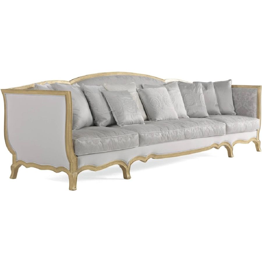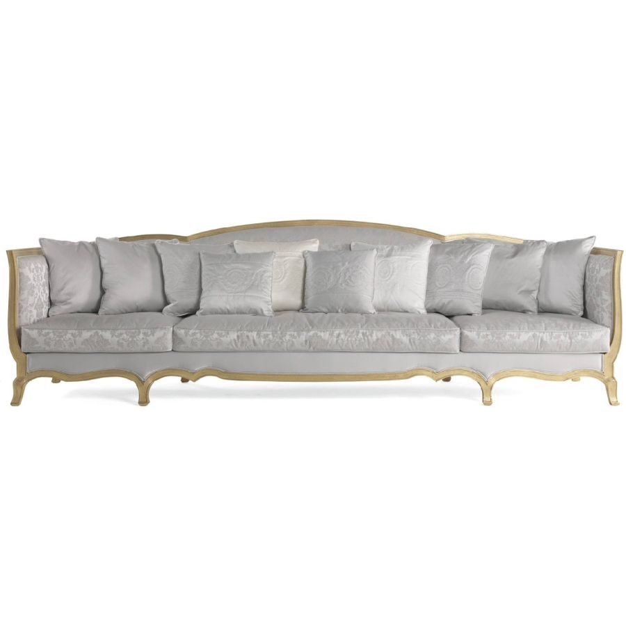 Grandcame is the perfect expression of a bright classic style, where the refined upholstery in precious fabric of the collection meets the decorative charm of the structure with finish in antique gold with patina.