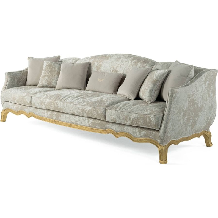 GrandCame is the perfect expression of a bright classic style, where the refined upholstery in precious fabric of the collection meets the decorative charm of the structure with finish in antique gold with patina.