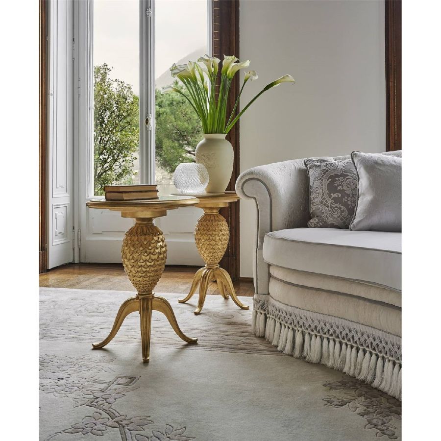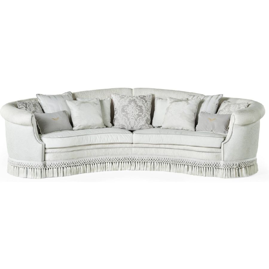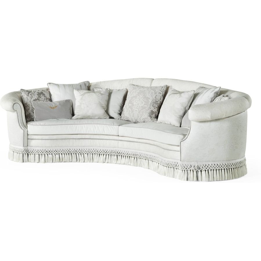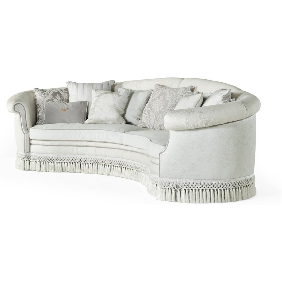 A soft, sinuous line characterises the Melrose sofa. Its elegance is underlined by the precious fabric that covers it; the semi-circular shape is emphasised by a double white fringe that lends an extra touch of refinement, a detail that makes this piece of furniture truly special.