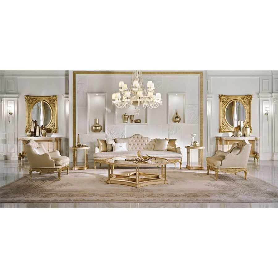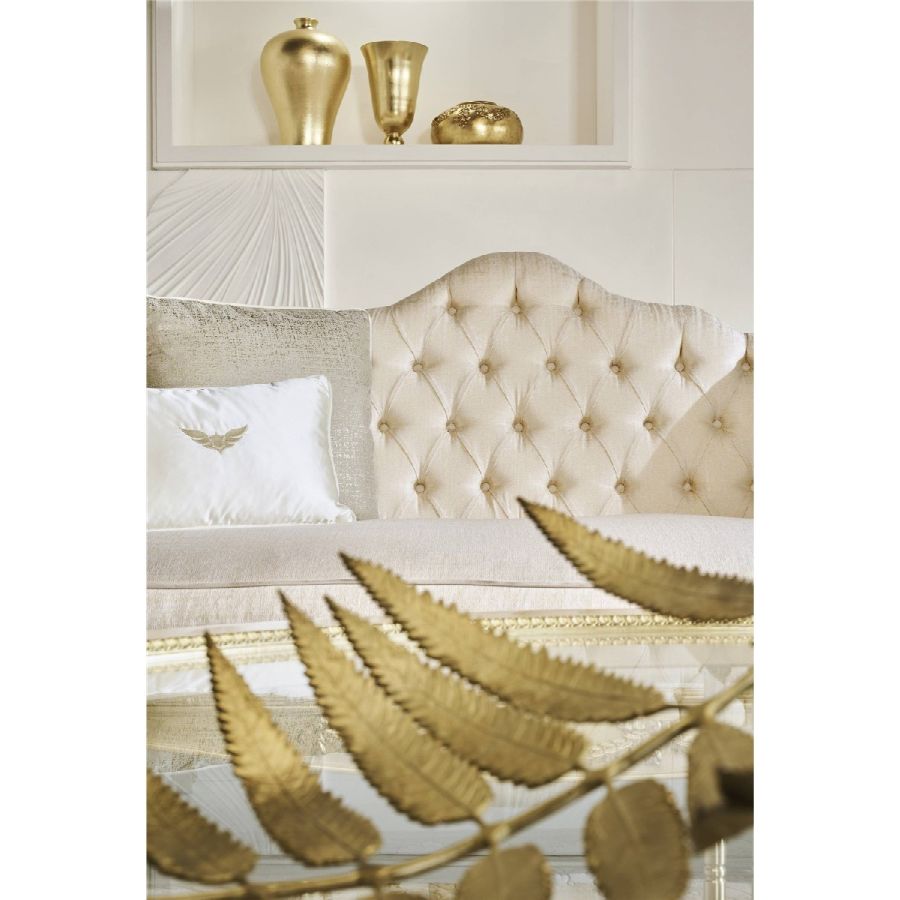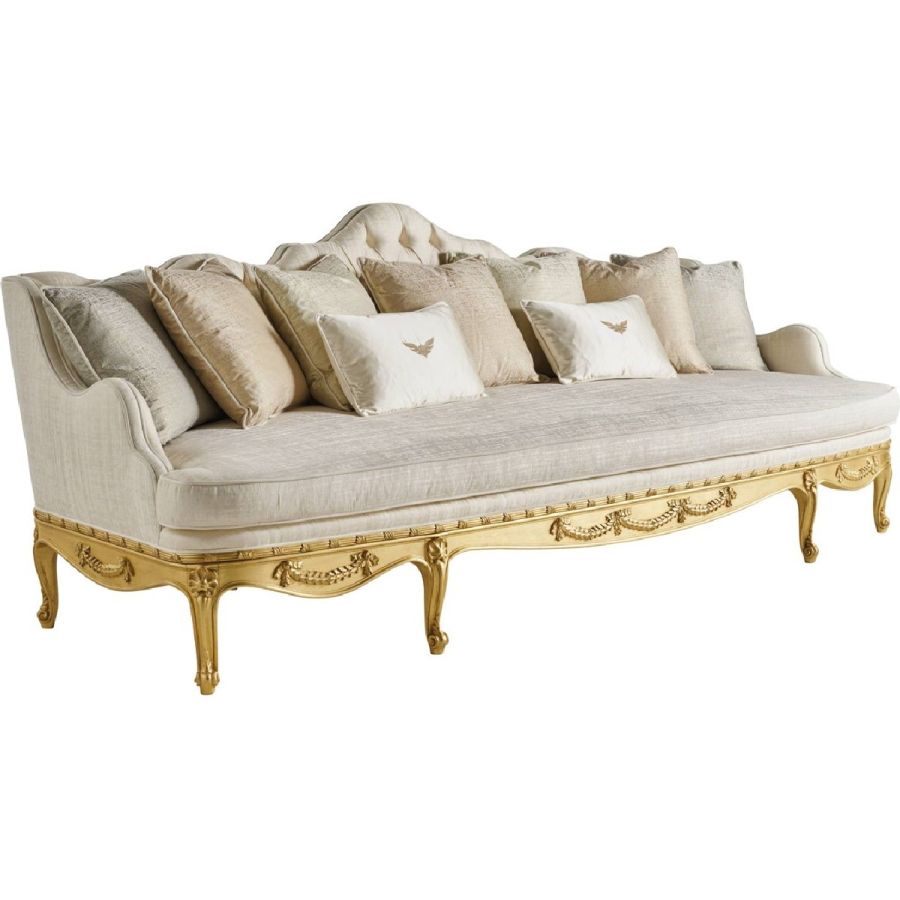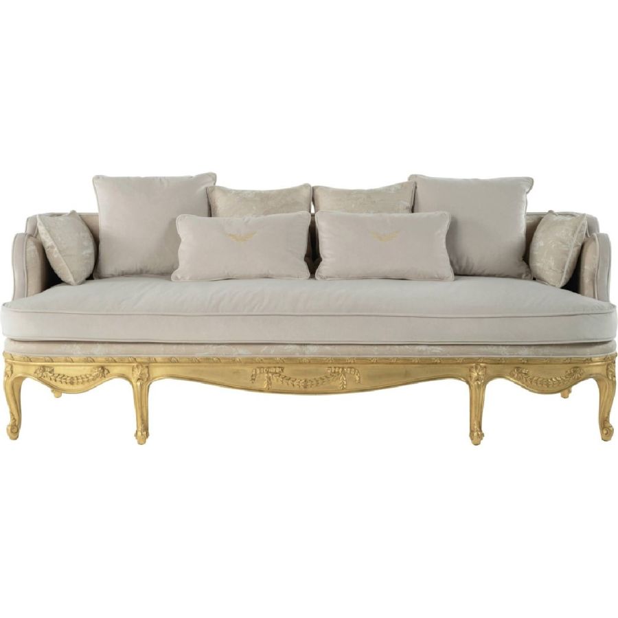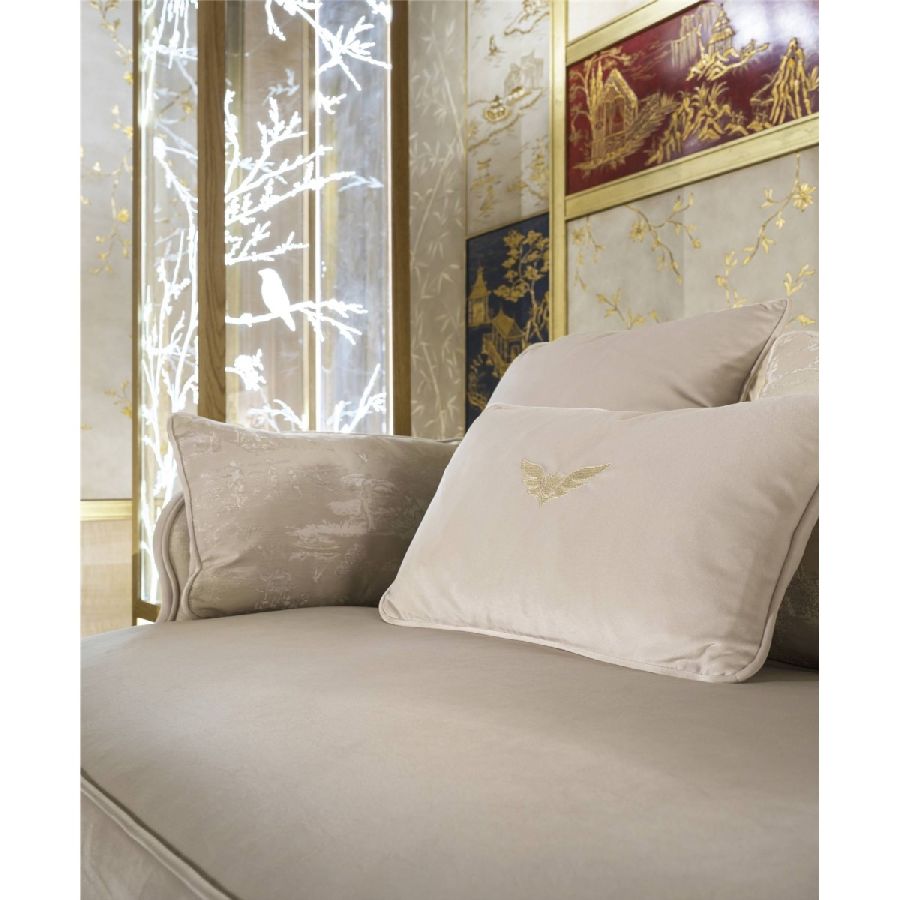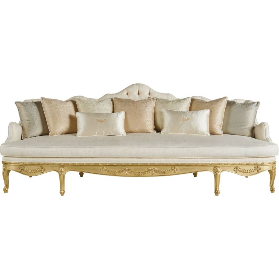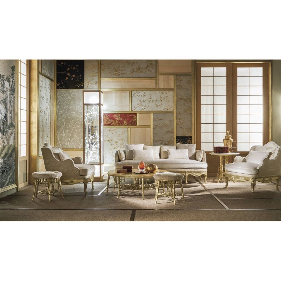 Sensual and welcoming, Verveine furniture embellishes any environment with its French flavour. In addition to the base in hand-carved wood with patinated antique gold finishing, Verveine is characterised by the complex wave-style upholstery of the top part of the back and armrests.