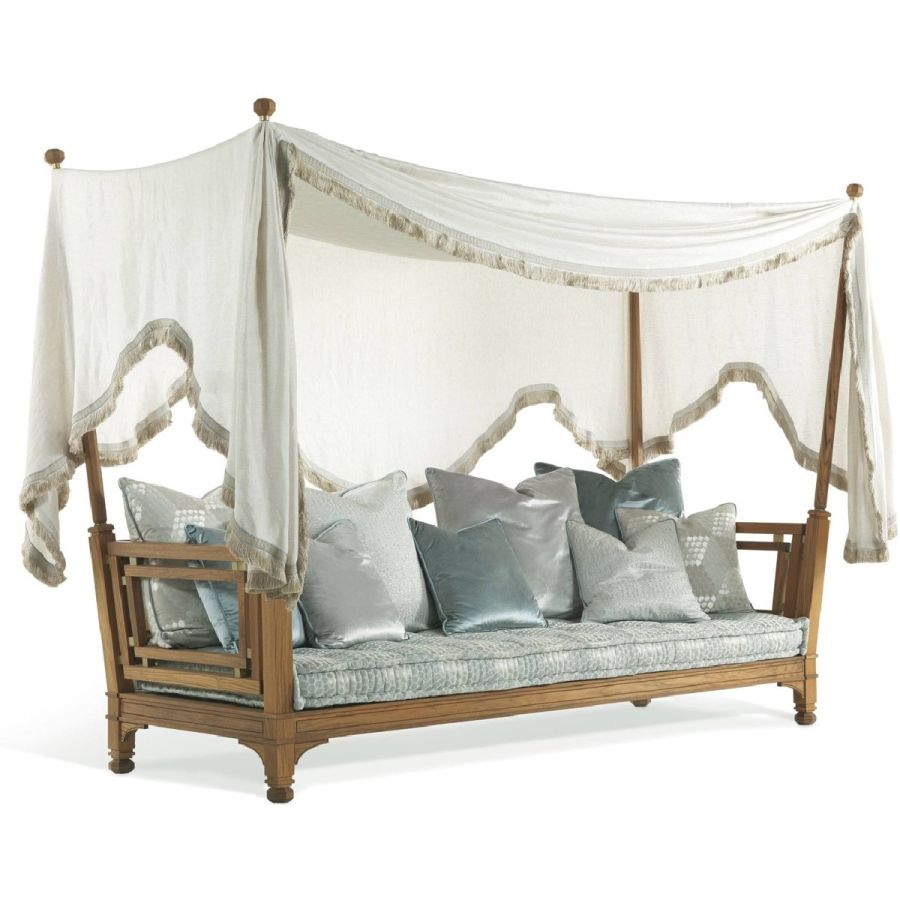 An elegant and graceful canopy sofa perfect for creating a corner with a magical and fairy-tale atmosphere in the garden. Characterized by a teak wood structure with outdoor finish, it is completed by soft cushions and light curtains. The ideal refuge to relax and enjoy your free time during the summer.