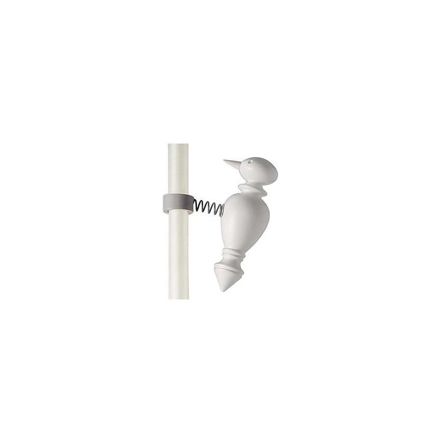 Accipicchio is a minimalist floor lamp inspired by the world of fauna: the axis of light, made of satin white glass, can be transformed by sliding a white woodpecker along the diffuser or connecting it with a thick black polyethylene net that attenuates the light.