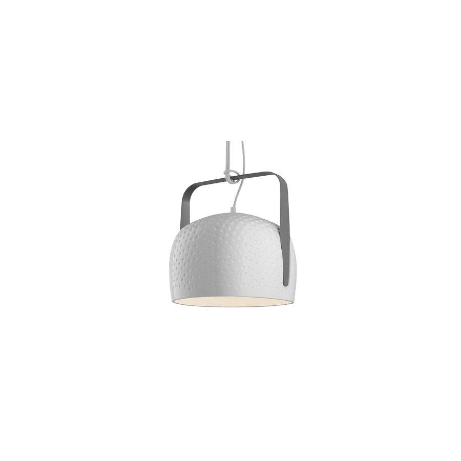 The bag consists of a glossy ceramic bowl with a soft and comfortable shape. It is supported by a handle-shaped metal element that can be hung from the ceiling, floor, or table. The bag has a polished white or bronze ceramic body with a smooth or textured surface, which can provide direct or soft light depending on the type.