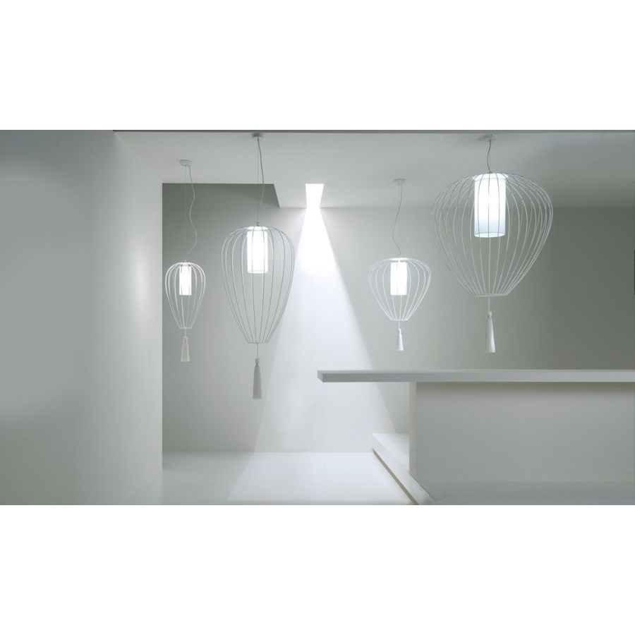 Cell emulates the structure and spirit of Chinese lanterns in the form of a pendants or floor lamps.The lampshades are made of glowing linen hearts for indoor use and opalescent plexiglass for outdoor use. The lamp is completed with a white silk tassel or, in the bronze version, a black silk tassel.