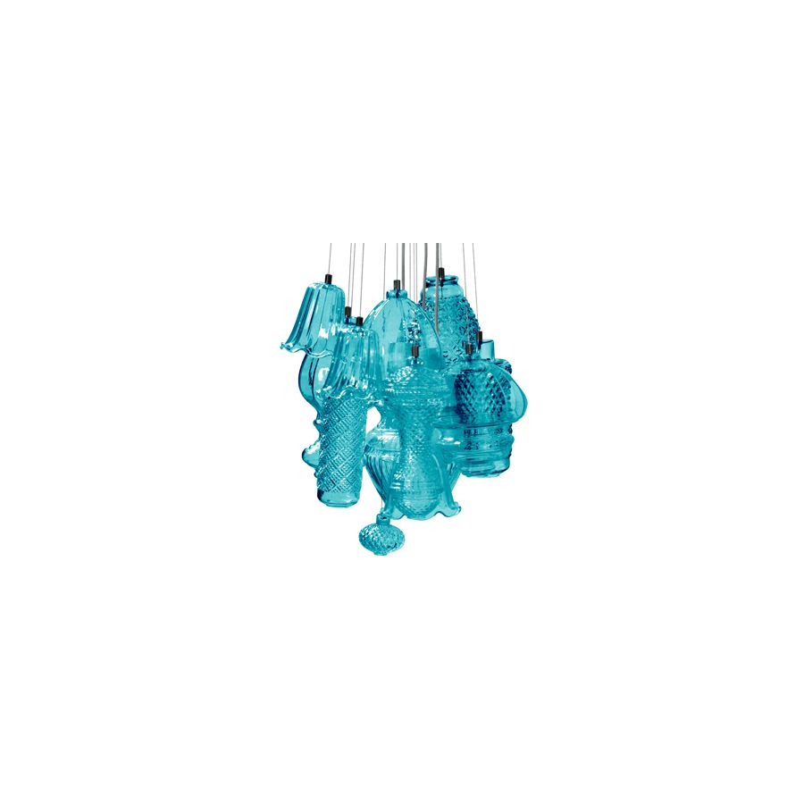 Like a chorus of bells or a bouquet of spring flowers, Ceraunavolta mixes 12 different lampshades, each with its own special treatment and decoration. These lampshades are made of transparent or polished blue Tiffany glass, using the original molds from the 1970s.